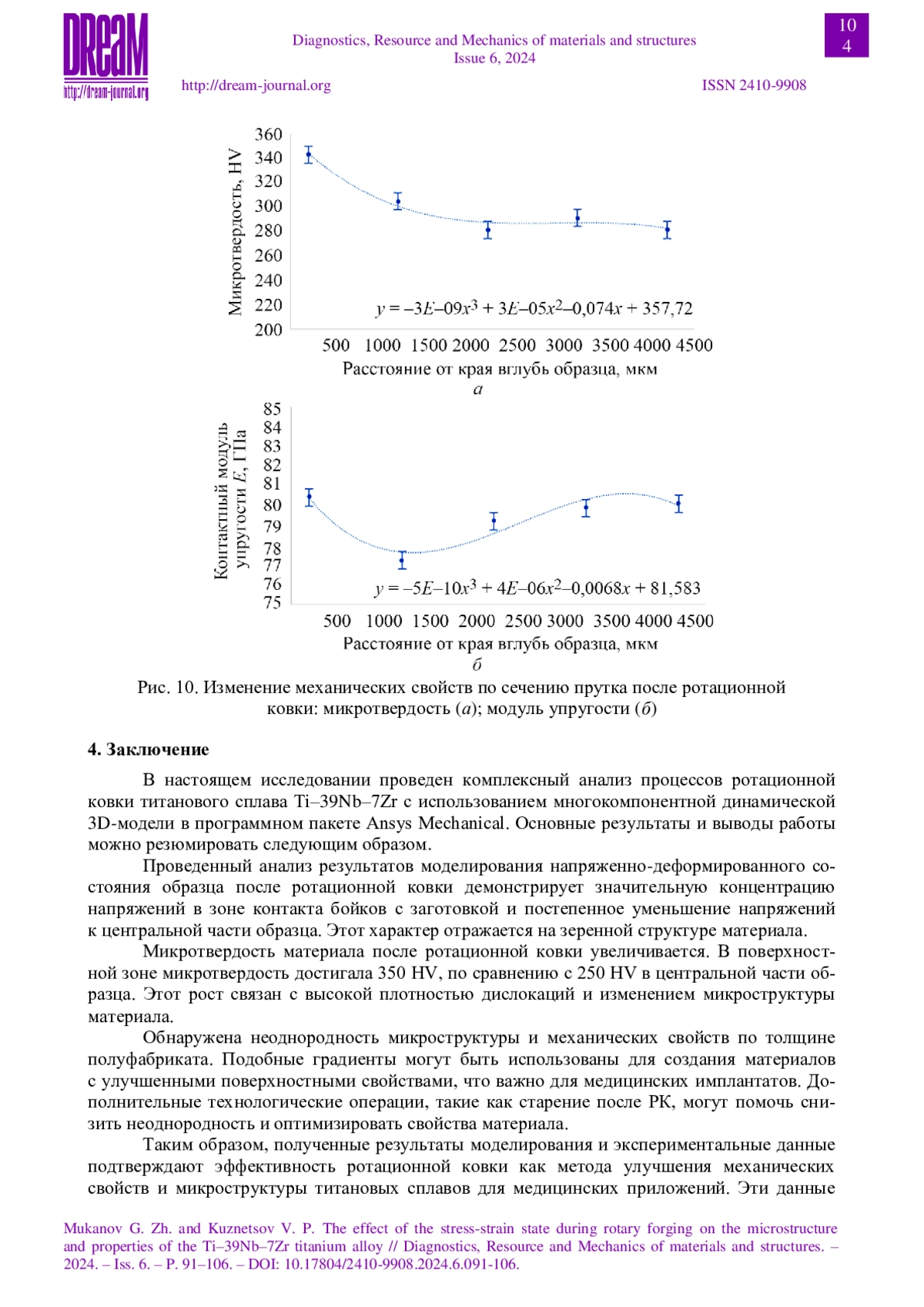 Исследование микроструктуры сплава после ротационной ковки показало наличие значительных пластических деформаций и высокую плотность дислокаций в поверхностной зоне. Микротвердость материала увеличилась до 350 HV в поверхностной зоне, по сравне-нию с 250 HV в центральной части образца. Ротационная ковка приводит к формированию текстуры и анизотропии механических свойств, что подтверждается измерениями модуля упругости, который варьируется от 70 до 90 ГПа по сечению прутка.