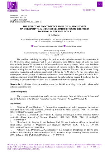 4. Arbuzov V. L., Druzhkov A. P., Danilov S. E. Effects of phosphorus on defects accumula-tion and annealing in electron-irradiated Fe–Ni austenitic alloys // Journal of Nuclear Materials. – 2001. – Vol. 295. – P. 273–280. – DOI: 10.1016/S0022-3115(01)00505-0.