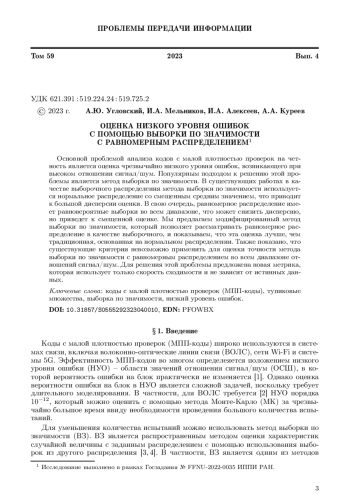 УГЛОВСКИЙ А. Ю., МЕЛЬНИКОВ И. А., АЛЕКСЕЕВ И. А., КУРЕЕВ А. А. ОЦЕНКА НИЗКОГО УРОВНЯ ОШИБОК С ПОМОЩЬЮ ВЫБОРКИ ПО ЗНАЧИМОСТИ С РАВНОМЕРНЫМ РАСПРЕДЕЛЕНИЕМ // ПРОБЛЕМЫ ПЕРЕДАЧИ ИНФОРМАЦИИ. 2023. Т. 59 № 4