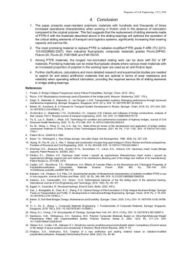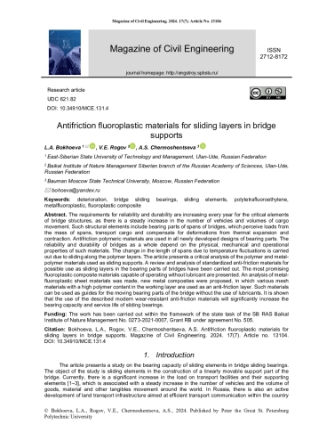 15. Adamov, A.A., Kamenskikh, A.A., Nosov, Yu.O. Deformational behavior of the flat sliding layer of the spherical bearing. International Journal of Civil Engineering and Technology. 2019. 10(5). Pp. 99–107.