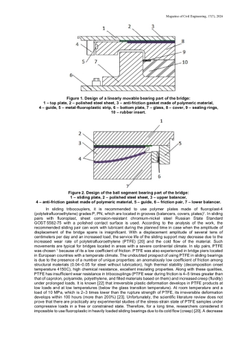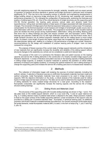 The article presents a study on the bearing capacity of sliding elements in bridge sliding bearings. The object of the study is sliding elements in the construction of a linearly movable support part of the bridge. Currently, there is a significant increase in the load on transport facilities and their supporting elements [1–3], which is associated with a steady increase in the number of vehicles and the volume of goods, material and other tangibles movement around the world.