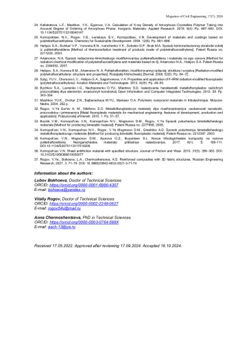 23. Khatipov, S.A., Artamonov, N.A. Сreation of a new antifriction and sealing material based on radiation-modified polytetrafluoroethylene. Rossijskij Khimicheskij Zhurnal. 2008. 52(3). Pp. 89–96.