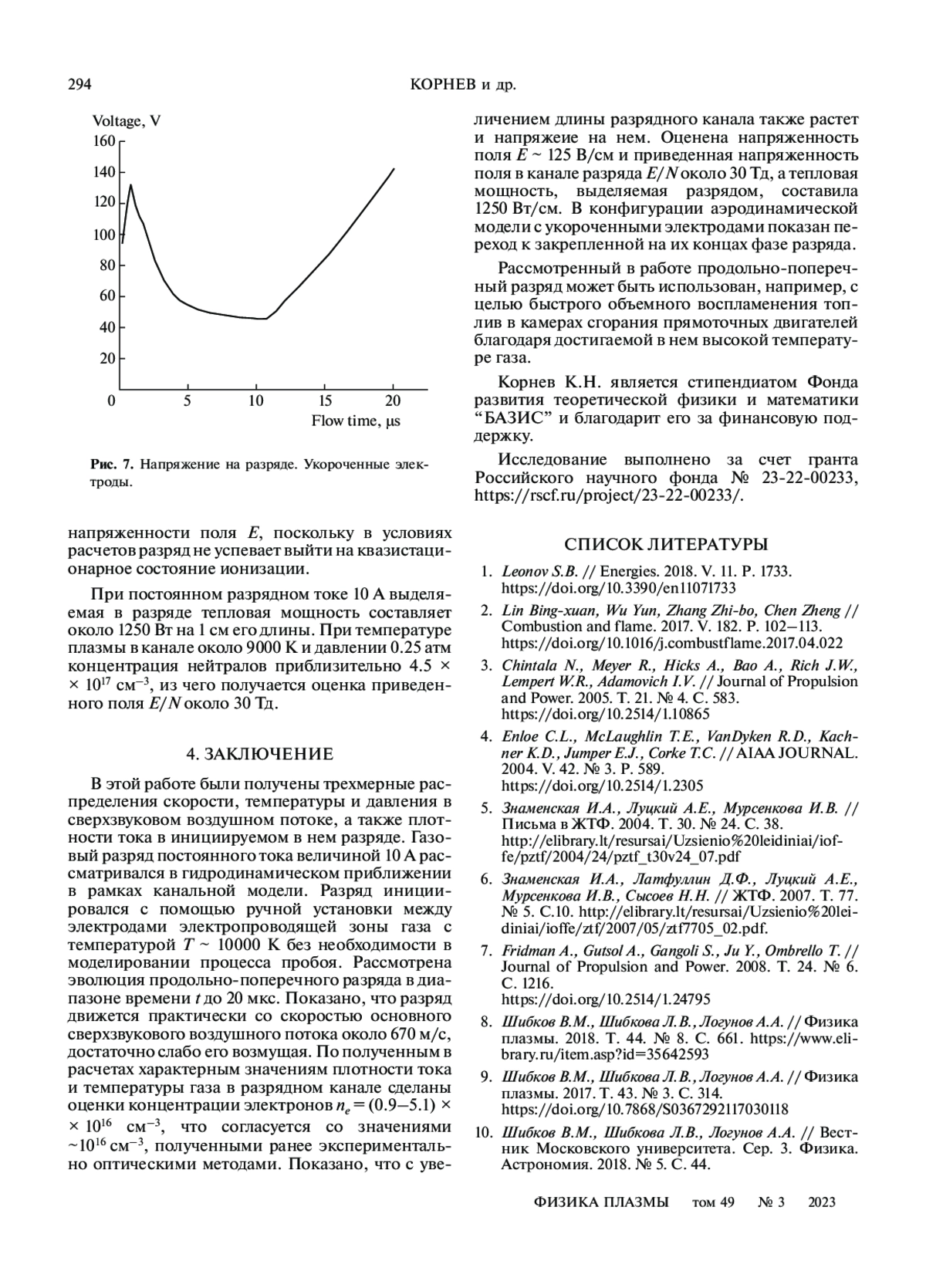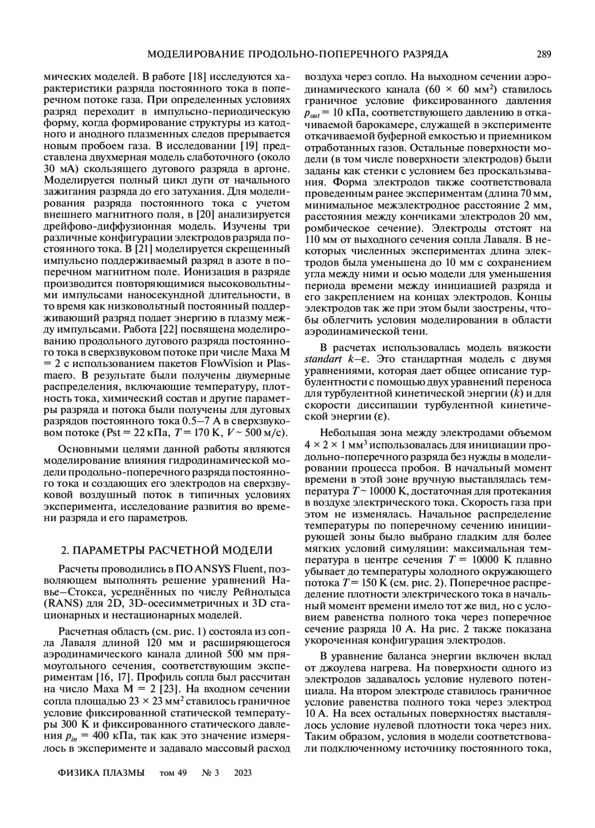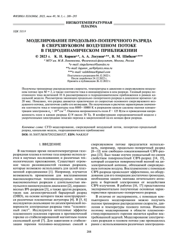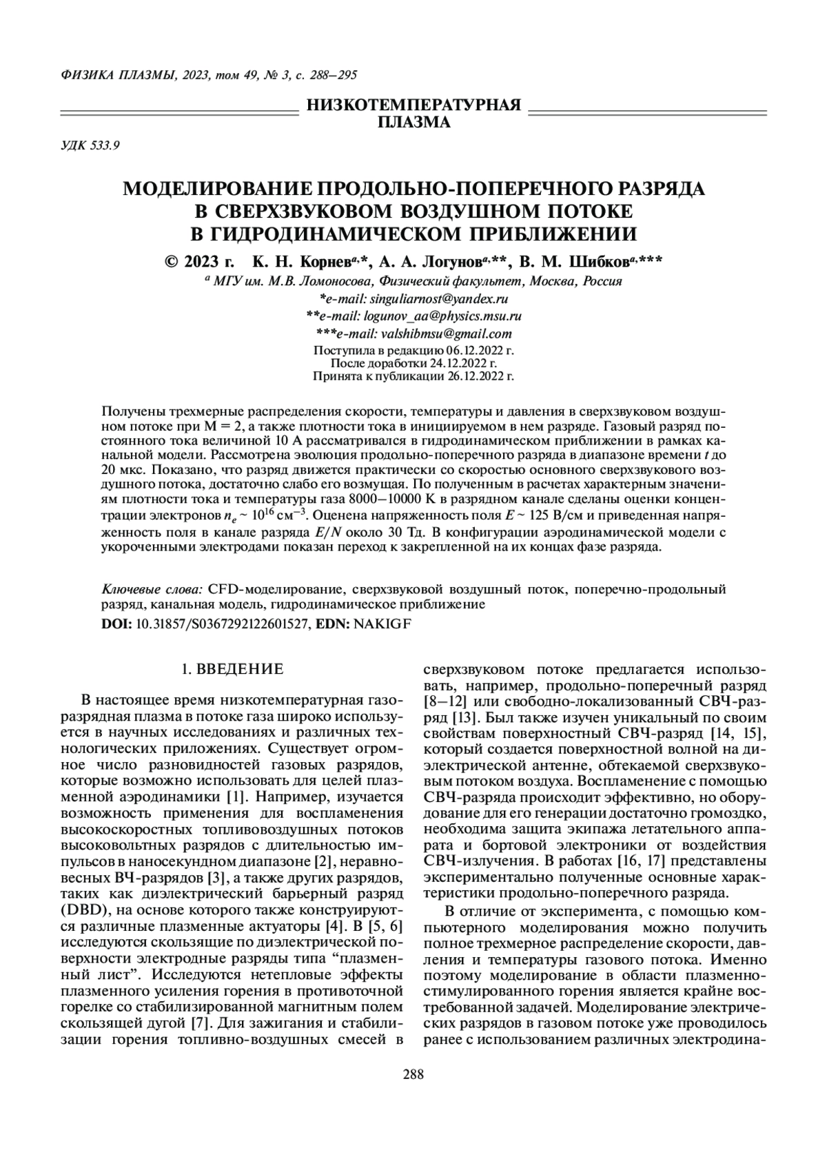 Статья: МОДЕЛИРОВАНИЕ ПРОДОЛЬНО-ПОПЕРЕЧНОГО РАЗРЯДА В СВЕРХЗВУКОВОМ ВОЗДУШНОМ ПОТОКЕ В ГИДРОДИНАМИЧЕСКОМ ПРИБЛИЖЕНИИ (2023)
