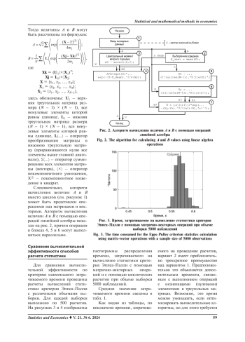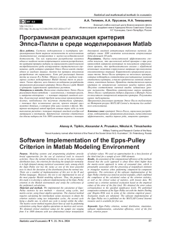 Цель работы. Системы моделирования и платформы программирования дают широкие возможности по использованию статистических инструментов в научно-исследовательской деятельности. Так как нормальное распределение является одним из наиболее часто встречающихся законов распределения, то критерий проверки выборки на нормальность имеет высокую востребованность среди инструментов статистического оценивания, среди которых критерий Эппса-Палли имеет статус одного из наиболее мощных. тестов для проверки отклонения распределения от нормального. Есть ряд реализаций данного теста на языках R и Python. Однако в одной из наиболее популярных систем моделирования Matlab данный тест не реализован. Таким образом, цель данного исследования разработать программную реализацию критерия Эппса-Палли в среде Matlab и проверить корректность проводимых расчетов. Материалы и методы. Вычисление статистики Эппса-Палли реализовано двумя методами - классическим, с помощью циклов, и матрично-векторным - с помощью операций линейной алгебры. Классический метод требует вычисления промежуточных величин, необходимых для получения статистики критерия, с помощью двух независимых циклов, причем второй цикл является двойным, в котором один цикл вложен в другой. Матрично-векторный метод требует меньше строк кода за счет выполнения расчетов с помощью операций линейной алгебры над матрицами и векторами. Критические значения статистики для объема выборки от 8 до 1000 элементов получены с помощью двухмерной линейной интерполяции табличных значений. Для выборки свыше 1000 элементов использована аппроксимация бета-функцией III рода. Результаты. Оценка вычислительной эффективности способов показала, что циклический подход примерно в три раза превосходит матрично-векторный по показателю затрачиваемого времени, что предположительно связано с обработкой незначащих элементов в треугольных матрицах при выполнении покомпонентных операций. Корректность программной реализации теста Эппса-Палли проверена на нескольких примерах, которые подтвердили соответствие рассчитываемых значений статистики критерия, а также критических значений статистики, известным данным. Проведена статистическая оценка критерия по эмпирическим значениям ошибки первого рода. Получено соответствие значений ошибок задаваемым уровням значимости. Проведены сравнительные оценки критерия Эппса-Палли с критериями Андерса-Дарлинга и Шапиро-Уилка по показателю эмпирической мощности критерия. Результаты оценок табулированы. Программная реализация критерия Эппса-Палли опубликована на Интернет-ресурсе MATLAB Central и доступна для свободного использования.