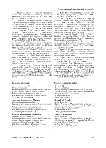 10. Razali N.M., Wah Y.B. Power comparisons of Shapiro-Wilk, Kolmogorov-Smirnov, Lilliefors and Anderson-Darling tests // Journal of Statistical Modeling and Analytics. 2011. Т. 2. № 1. С. 21-33.