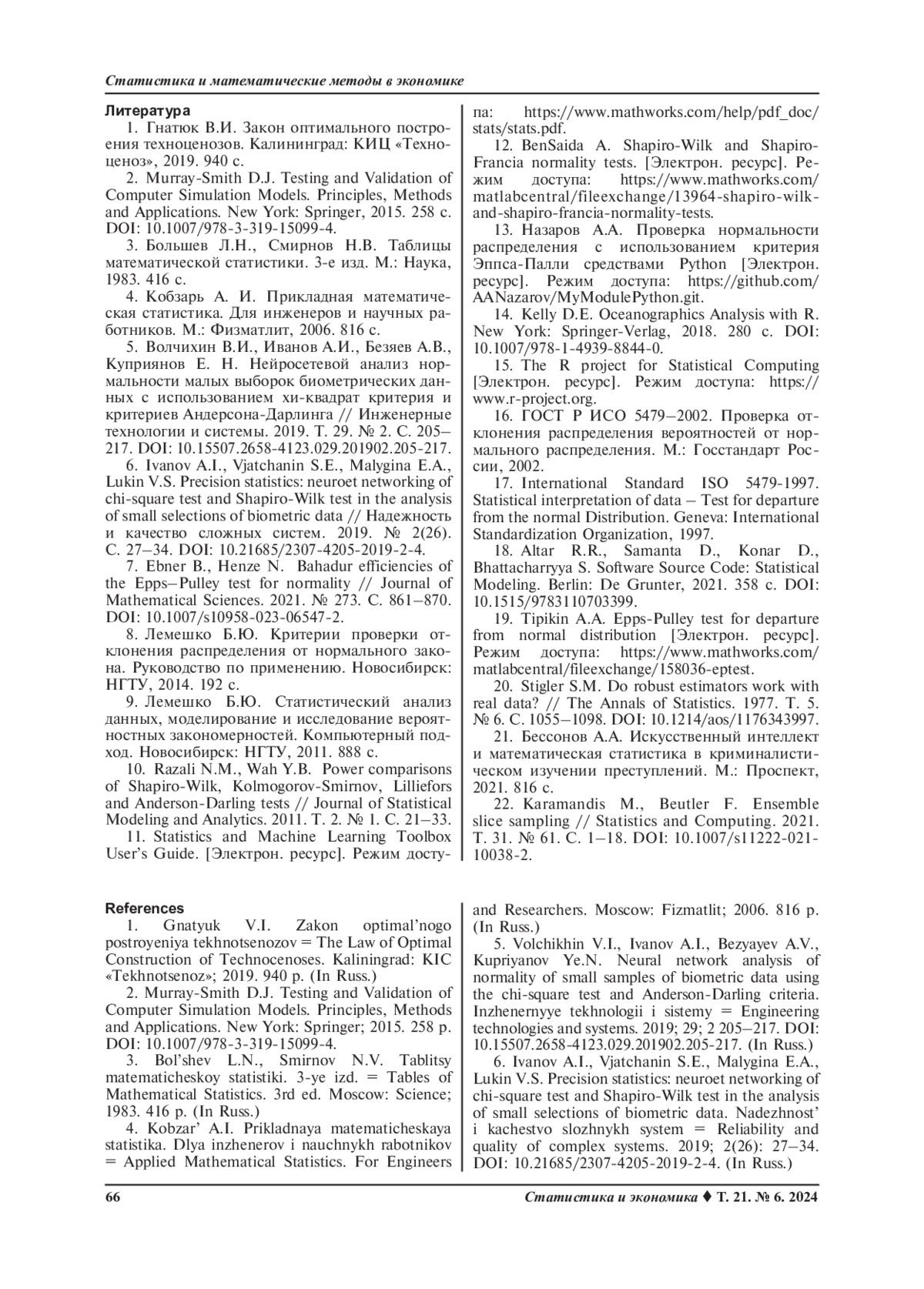 6. Ivanov A.I., Vjatchanin S.E., Malygina E.A., Lukin V.S. Precision statistics: neuroet networking of chi-square test and Shapiro-Wilk test in the analysis of small selections of biometric data // Надежность и качество сложных систем. 2019. № 2(26). С. 27-34. DOI: 10.21685/2307-4205-2019-2-4 EDN: XJFLVT