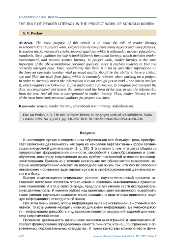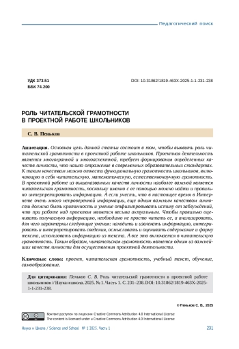 Основная цель данной статьи состоит в том, чтобы выявить роль читательской грамотности в проектной работе школьников. Проектная деятельность является многогранной и многоаспектной, требует формирования определенных качеств личности, что нашло отражение в современных образовательных стандартах. К таким качествам можно отнести функциональную грамотность школьников, включающую в себя читательскую, математическую, естественнонаучную грамотность. В проектной работе из вышеназванных качеств личности наиболее важной является читательская грамотность, поскольку именно с ее помощью можно найти и правильно интерпретировать информацию. А если учесть, что в настоящее время в Интернете очень много непроверенной информации, еще одним важным качеством личности должна быть критичность и умение отфильтровывать истину от заблуждений, что при работе над проектом является весьма актуальным. Чтобы правильно оценивать получаемую информацию, необходимо не просто читать ее, а анализировать, для чего характерны следующие умения: находить и извлекать информацию, интегрировать и интерпретировать сведения, осмысливать и оценивать содержание и форму текста, использовать информацию из текста. А все это включается в читательскую грамотность. Таким образом, читательская грамотность является одним из важнейших качеств личности для осуществления проектной деятельности.