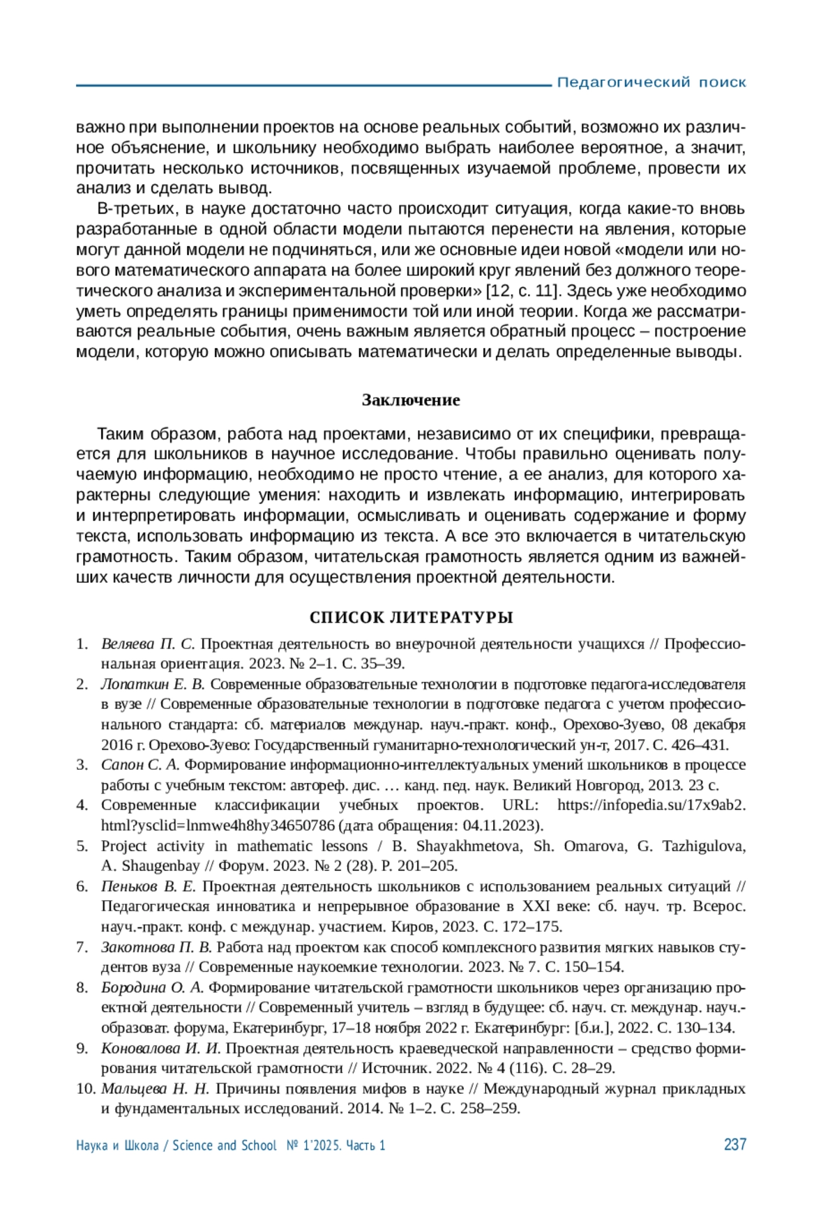 1. Веляева П. С. Проектная деятельность во внеурочной деятельности учащихся // Профессиональная ориентация. 2023. № 2-1. С. 35-39. EDN: OEDRIQ