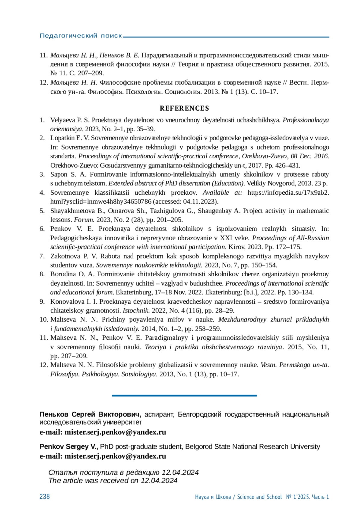 6. Пеньков В. Е. Проектная деятельность школьников с использованием реальных ситуаций // Педагогическая инноватика и непрерывное образование в XXI веке: сб. науч. тр. Всерос. науч.-практ. конф. с междунар. участием. Киров, 2023. С. 172-175. EDN: SVXFJL