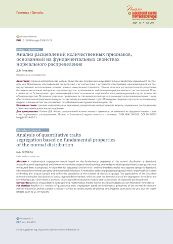 Описана математическая модель расщепления, основанная на фундаментальных свойствах нормального распределения. Предложены классификация расщеплений и их соотнесение с методикой исследования, ориентированной на преимущественное использование количественных (измеряемых) признаков. Описан алгоритм последовательного разделения би- и мультимодальных выборок на отдельные группы с применением свойства симметрии нормального распределения. Представлен метод балансировки групп, повышающий точность деления исходной выборки и унифицирующий подсчет количества объектов в группах. Продемонстрирована применимость описываемого метода к сложным распределениям различного вида, обеспечивающая определение формулы расщепления для выявленных групп. Приведены сведения о доступе к исполняемому модулю и исходным текстам специально разработанного инструментального средства.