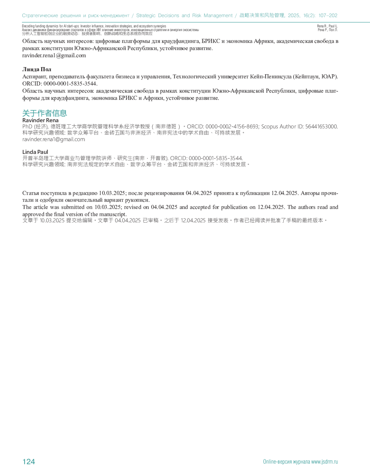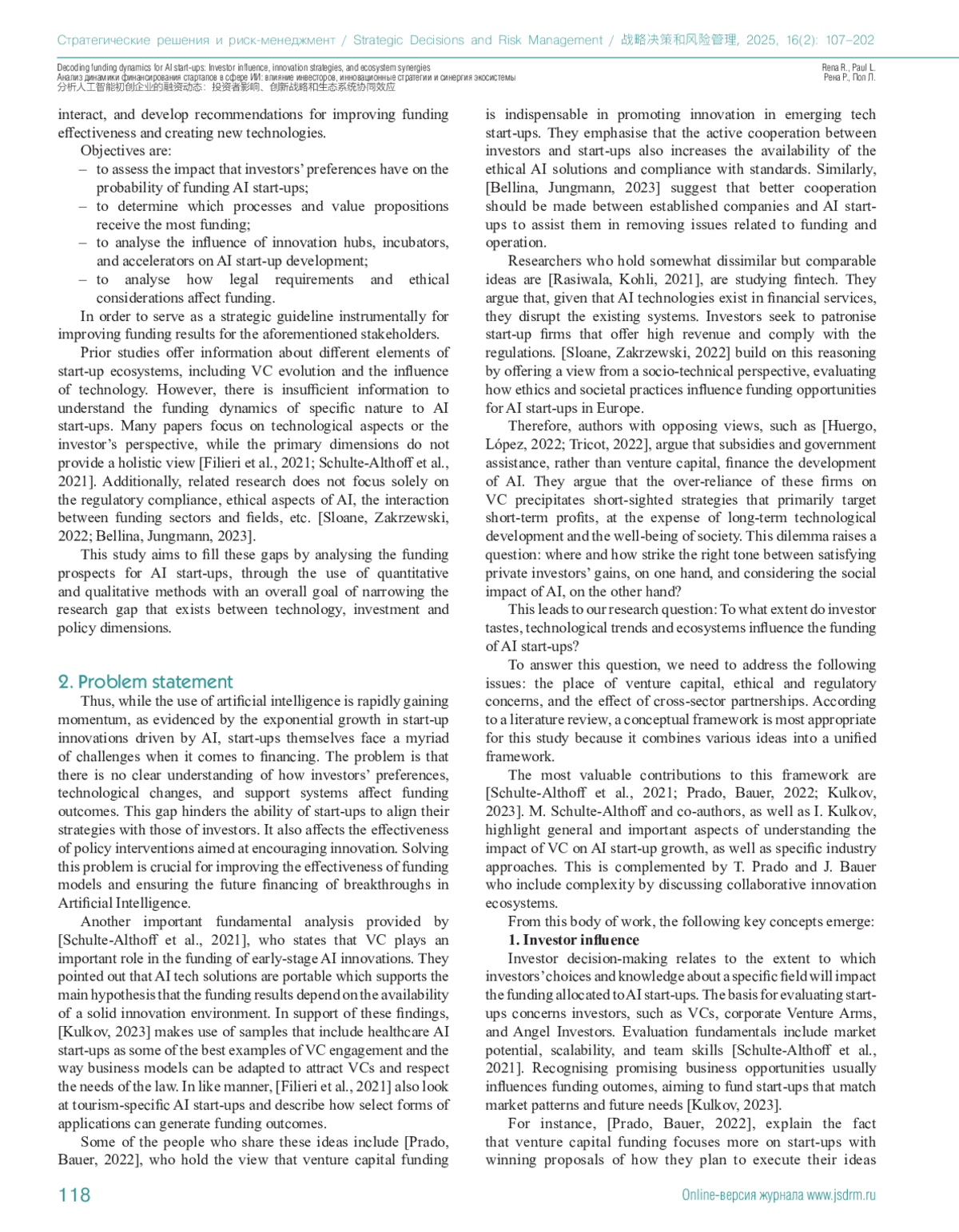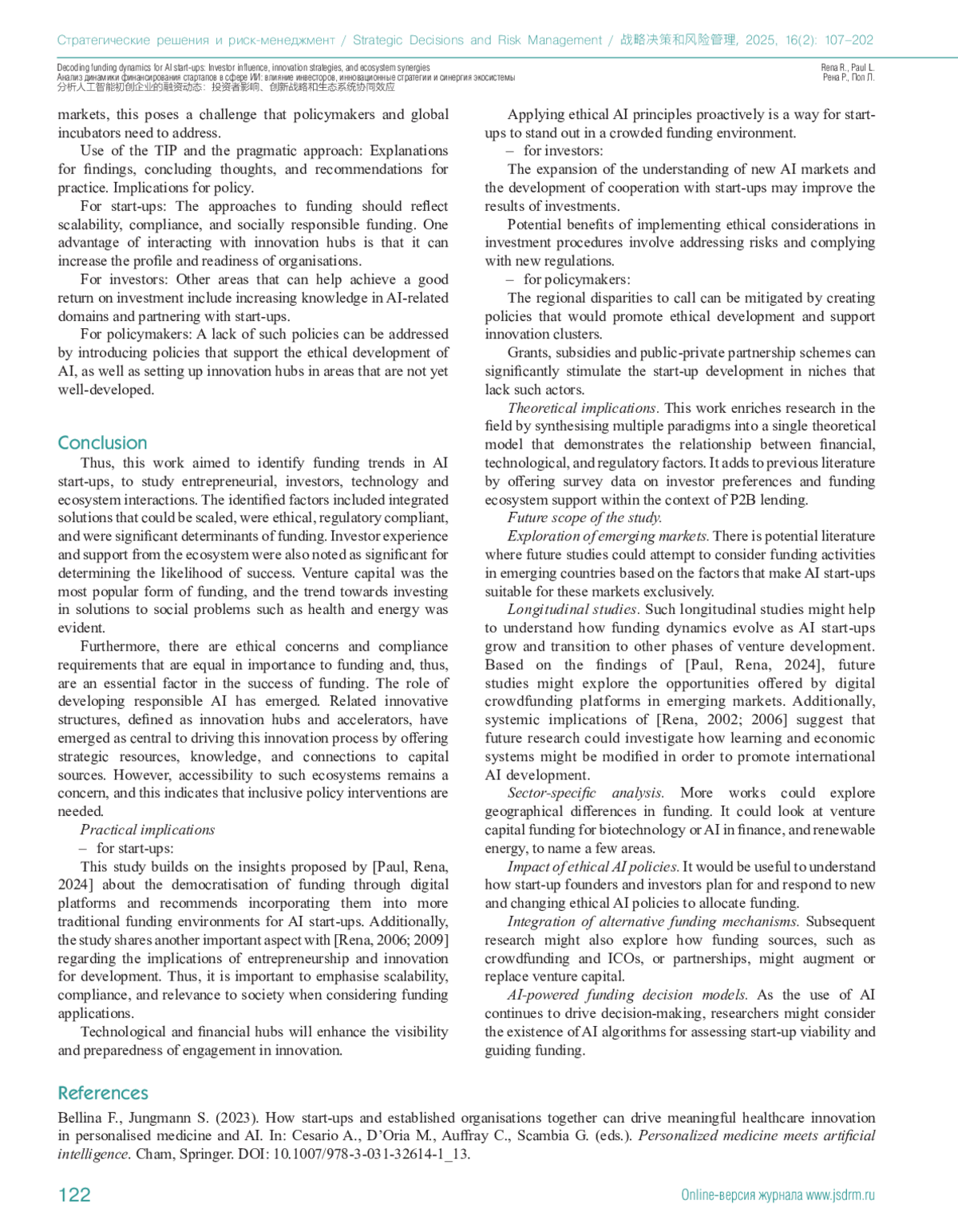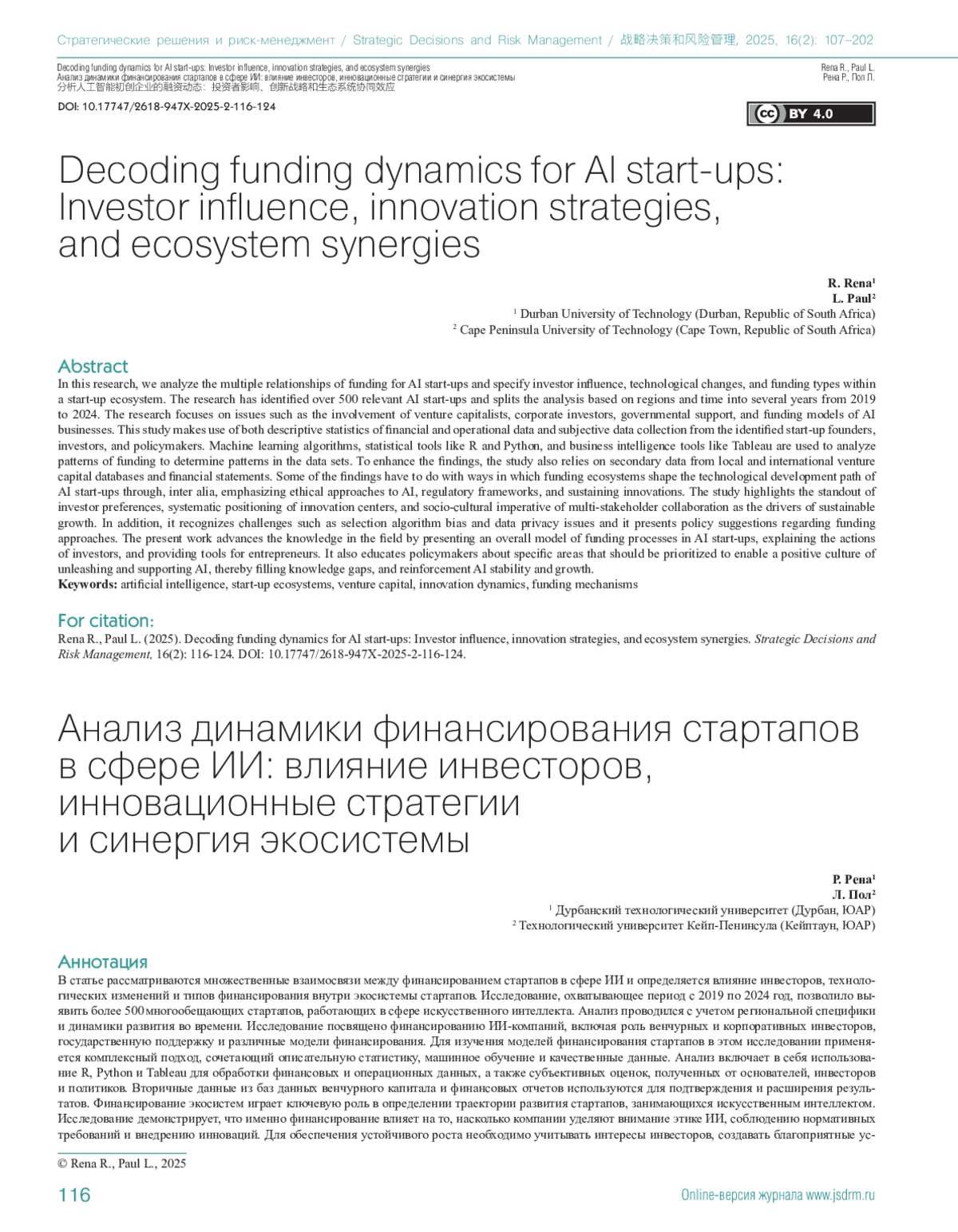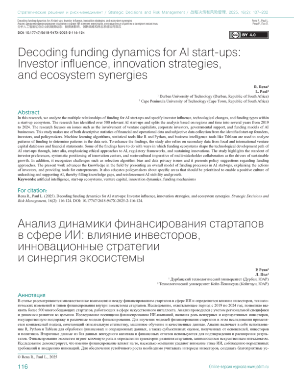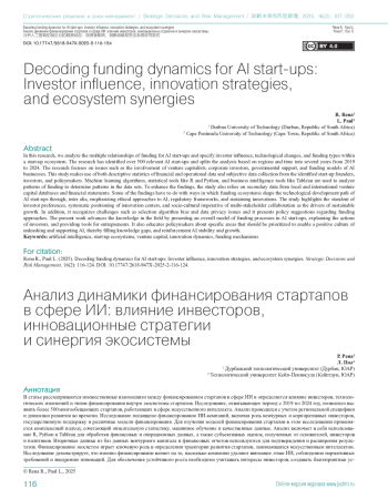 В статье рассматриваются множественные взаимосвязи между финансированием стартапов в сфере ИИ и определяется влияние инвесторов, технологических изменений и типов финансирования внутри экосистемы стартапов. Исследование, охватывающее период с 2019 по 2024 год, позволило выявить более 500 многообещающих стартапов, работающих в сфере искусственного интеллекта. Анализ проводился с учетом региональной специфики и динамики развития во времени. Исследование посвящено финансированию ИИ-компаний, включая роль венчурных и корпоративных инвесторов, государственную поддержку и различные модели финансирования. Для изучения моделей финансирования стартапов в этом исследовании применяется комплексный подход, сочетающий описательную статистику, машинное обучение и качественные данные. Анализ включает в себя использование R, Python и Tableau для обработки финансовых и операционных данных, а также субъективных оценок, полученных от основателей, инвесторов и политиков. Вторичные данные из баз данных венчурного капитала и финансовых отчетов используются для подтверждения и расширения результатов. Финансирование экосистем играет ключевую роль в определении траектории развития стартапов, занимающихся искусственным интеллектом. Исследование демонстрирует, что именно финансирование влияет на то, насколько компании уделяют внимание этике ИИ, соблюдению нормативных требований и внедрению инноваций. Для обеспечения устойчивого роста необходимо учитывать интересы инвесторов, создавать благоприятные условия для инновационных центров и развивать международное сотрудничество. В работе также анализируются риски, связанные с предвзятостью алгоритмов и защитой конфиденциальных данных, и предлагаются рекомендации по формированию более эффективной политики финансирования. Исследование предлагает практическое руководство для стартапов в сфере ИИ, инвесторов и политиков. Оно представляет собой комплексную модель финансирования, объясняет мотивы инвесторов и предоставляет инструменты для предпринимателей, стремящихся привлечь капитал. Кроме того, исследование указывает политикам на приоритетные направления для создания благоприятной среды, способствующей развитию и поддержке ИИ, тем самым заполняя пробелы в знаниях и обеспечивая устойчивый рост отрасли.