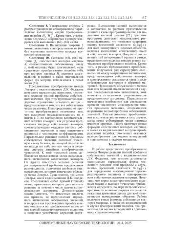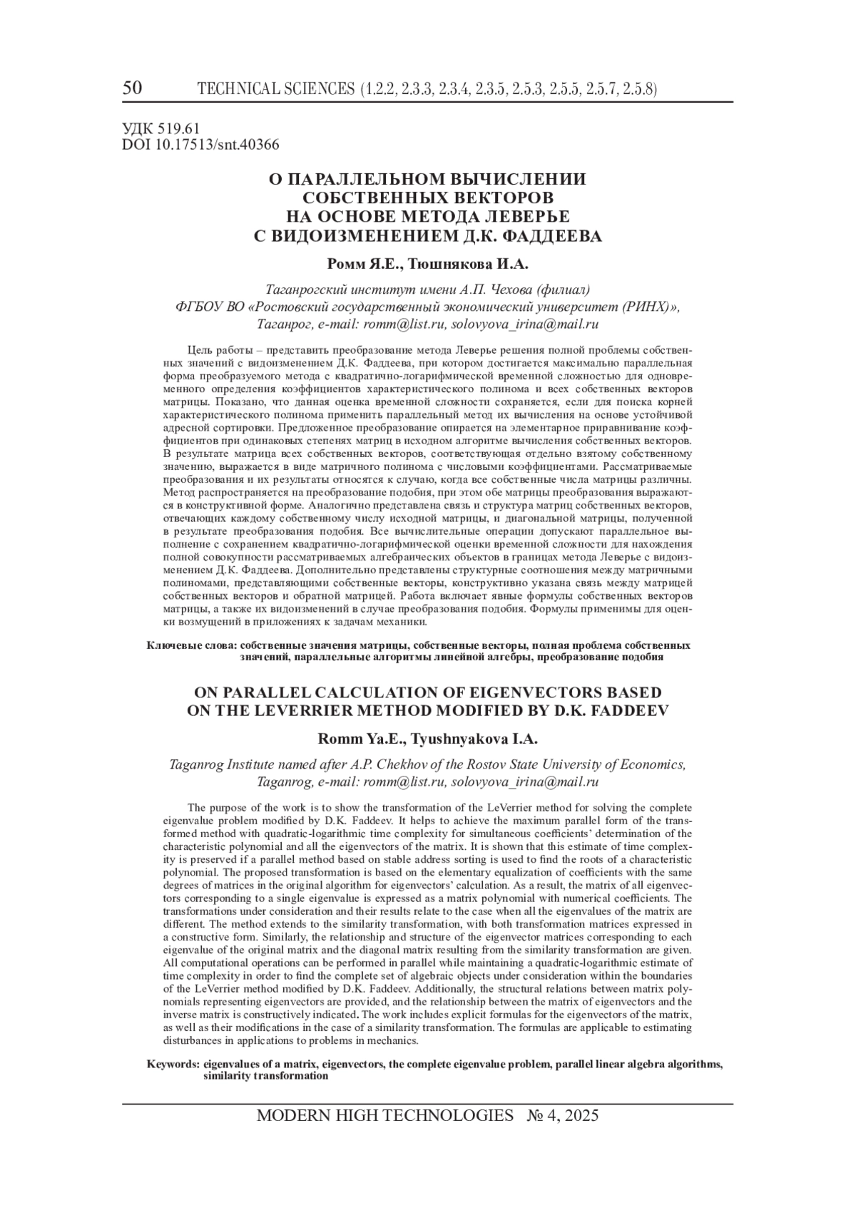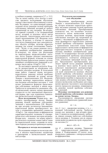 РОММ Я. Е., ТЮШНЯКОВА И. А. О ПАРАЛЛЕЛЬНОМ ВЫЧИСЛЕНИИ СОБСТВЕННЫХ ВЕКТОРОВ НА ОСНОВЕ МЕТОДА ЛЕВЕРЬЕ С ВИДОИЗМЕНЕНИЕМ Д. К. ФАДДЕЕВА // СОВРЕМЕННЫЕ НАУКОЕМКИЕ ТЕХНОЛОГИИ. 2025. № 4