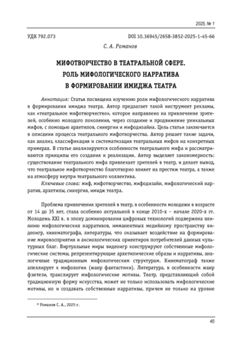 Статья посвящена изучению роли мифологического нарратива в формировании имиджа театра. Автор предлагает такой инструмент рекламы, как «театральное мифотворчество», которое направлено на привлечение зрителей, особенно молодого поколения, через создание и продвижение уникальных мифов, с помощью архетипов, синергии и мифодизайна. Цель статьи заключается в описании процесса театрального мифотворчества. Автор решает такие задачи, как анализ, классификация и систематизация театральных мифов на конкретных примерах. В статье анализируются особенности театрального мифа и рассматриваются принципы его создания и реализации. Автор выделяет закономерность: существование театрального мифа привлекает зрителей в театр, и делает вывод, что театральное мифотворчество благотворно влияет на престиж театра, а также на атмосферу внутри театрального коллектива.
