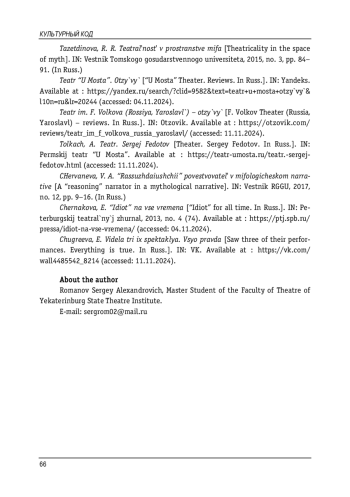 45. Тазетдинова, Р. Р. Театральность в пространстве мифа // Вестник Томского государственного университета. - 2015. - № 3. - С. 84-91.