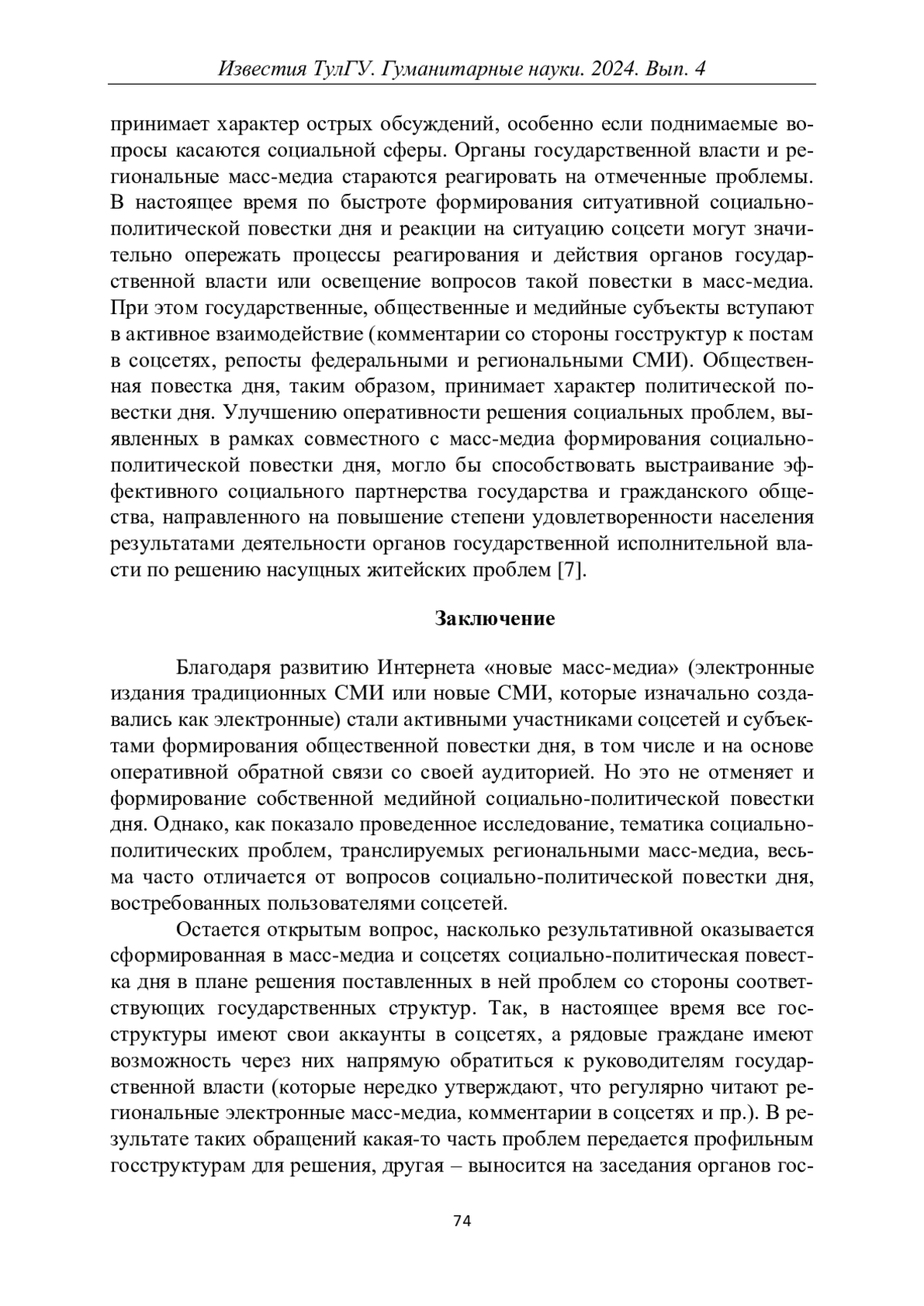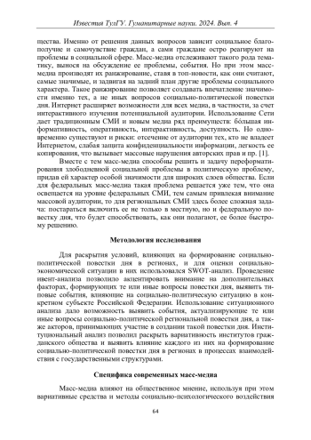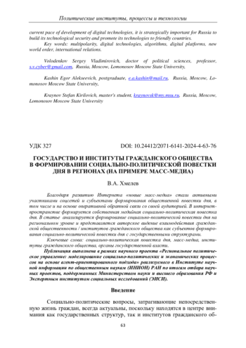 Благодаря развитию Интернета «новые масс-медиа» стали активными участниками соцсетей и субъектами формирования общественной повестки дня, в том числе и на основе оперативной обратной связи со своей аудиторией. В интернет-пространстве формируется собственная медийная социально-политическая повестка дня. В статье анализируется формирование социально-политической повестки дня на региональном уровне и представляется авторское видение взаимодействия гражданской общественности / институтов гражданского общества как субъектов формирования социально-политической повестки дня с государственными структурами.