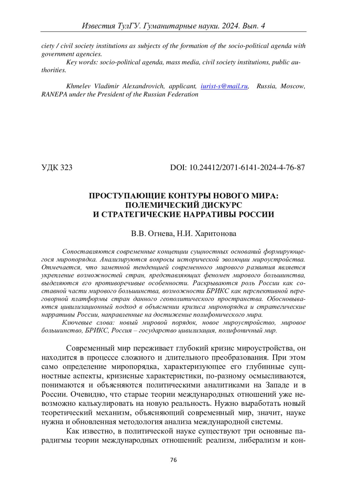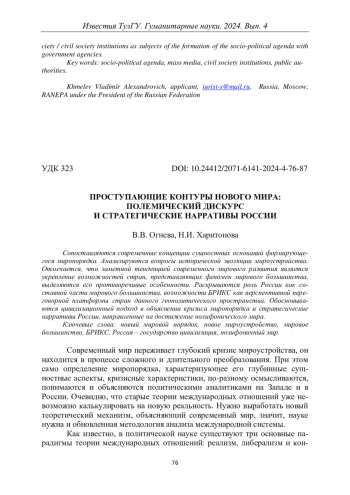Сопоставляются современные концепции сущностных оснований формирующегося миропорядка. Анализируются вопросы исторической эволюции мироустройства. Отмечается, что заметной тенденцией современного мирового развития является укрепление возможностей стран, представляющих феномен мирового большинства, выделяются его противоречивые особенности. Раскрываются роль России как составной части мирового большинства, возможности БРИКС как перспективной переговорной платформы стран данного геополитического пространства. Обосновываются цивилизационный подход в объяснении кризиса миропорядка и стратегические нарративы России, направленные на достижение полифонического мира.