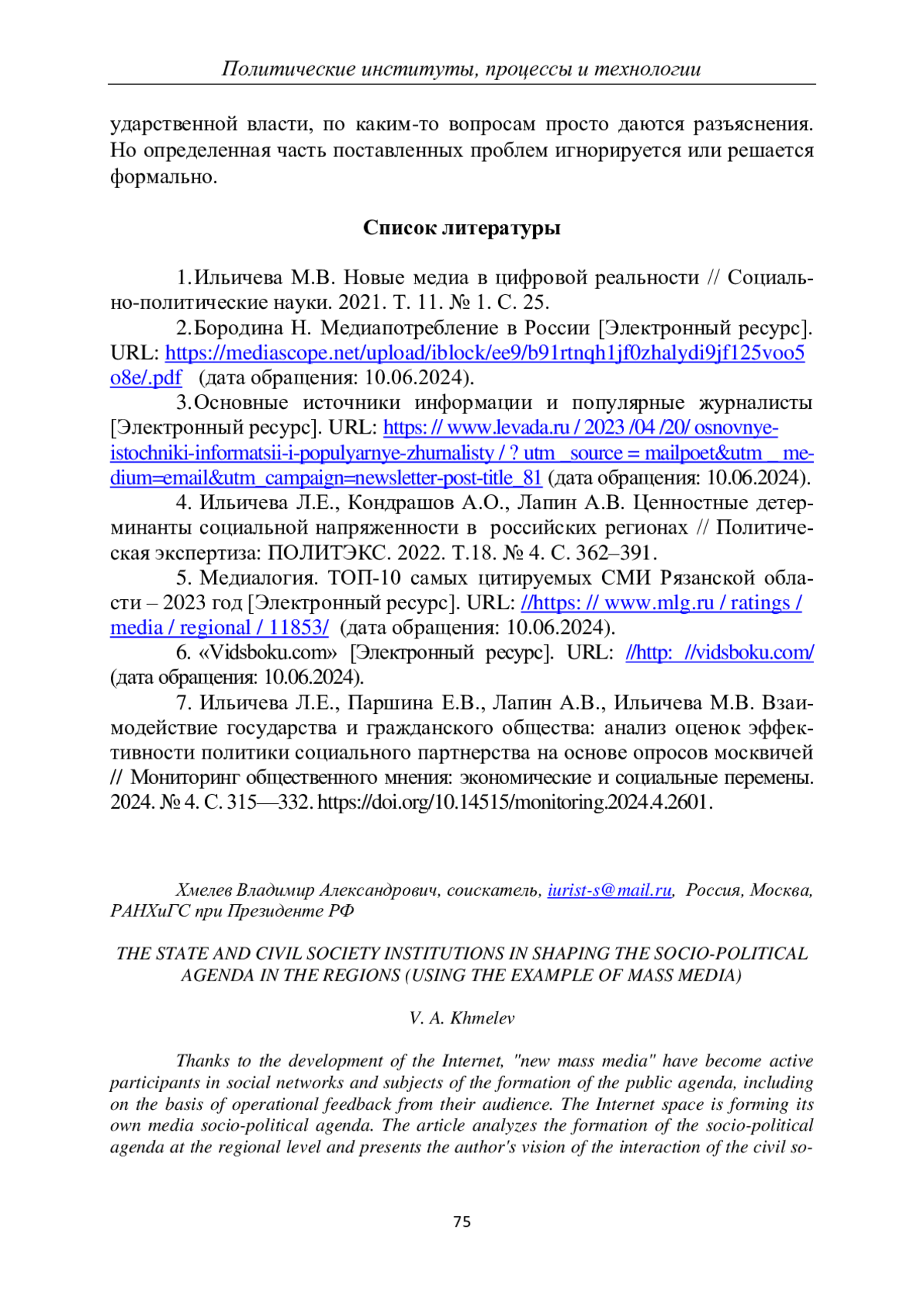 7. Ильичева Л.Е., Паршина Е.В., Лапин А.В., Ильичева М.В. Взаимодействие государства и гражданского общества: анализ оценок эффективности политики социального партнерства на основе опросов москвичей // Мониторинг общественного мнения: экономические и социальные перемены. 2024. № 4. С. 315-332. https:. DOI: 10.14515/monitoring.2024.4.2601 EDN: LMQANI