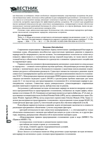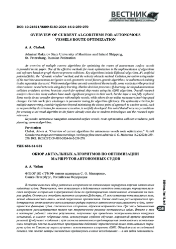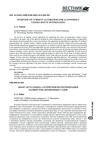 В статье выполнен обзор различных алгоритмов по оптимизации маршрутов морских автономных надводных судов. Отмечается, что актуальным и действенным методом оптимизации маршрутов является внедрение алгоритмов и программной базы по предотвращению столкновения, основанных на теории графов. Основными способами являются алгоритм Дейкстры, А*, искусственные потенциальные поля, метод «динамического окна», метод скоростного препятствия. Также отдельно рассматривается предотвращение столкновения с использованием радара морского автономного навигационного судна, геометрических факторов судов, генетического алгоритма, обучения нейронной сети. При этом большинство алгоритмов рассматривается только как теоретическое решение поставленных задач. Вместе с тем в некоторых работах описаны результаты, полученные при проведении экспериментальных натурных испытаний, а именно: нейронные сети, использующие глубокое обучение, марковский процесс принятия решений, Q-обучение; созданная с нуля система автономного предотвращения столкновения с использованием концепции поиска заменяемого пространства действий; эвристический поиск оптимального маршрута судна по Северному морскому пути с использованием алгоритма А2015. Общий анализ исследований показал, что многие авторы значительно продвинулись в своих исследованиях - в них видна положительная динамика исследования, однако необходимо совершенствовать существующие алгоритмы для решения поставленных задач, поскольку в одних работах не рассматривается расхождение с несколькими судами, в других не используется маневр, связанный с изменением скорости, в отдельных работах существует сложность настройки параметров для эффективной работы алгоритма. Не в полной мере разработан также критерий оптимальности при совместном маневрировании, учитывающий не только обеспечение минимального значения кратчайшей дистанции до судна в системе, но и другие факторы, такие как распределение обязанностей по выполнению маневров судов.