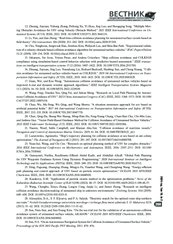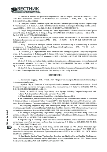 7. Mu D. Geometric Collision Avoidance Algorithm for Unmanned Surface Vehicle Based on Multi-objective / D. Mu, T. Li, X. Han, Y. Fan, X. Sun, Y. Liu // 2022 5th International Conference on Intelligent Autonomous Systems (ICoIAS). - IEEE, 2022. - Pp. 159-165. DOI: 10.1109/ICoIAS56028.2022.9931210