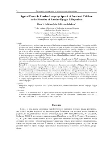 Вопрос о том, какие механизмы задействуются в освоении русского языка, широко изучается на материале речи билингвов. Большинство исследований такого рода основываются на данных двуязычных детей, для которых русский является родным, но не доминантным языком.