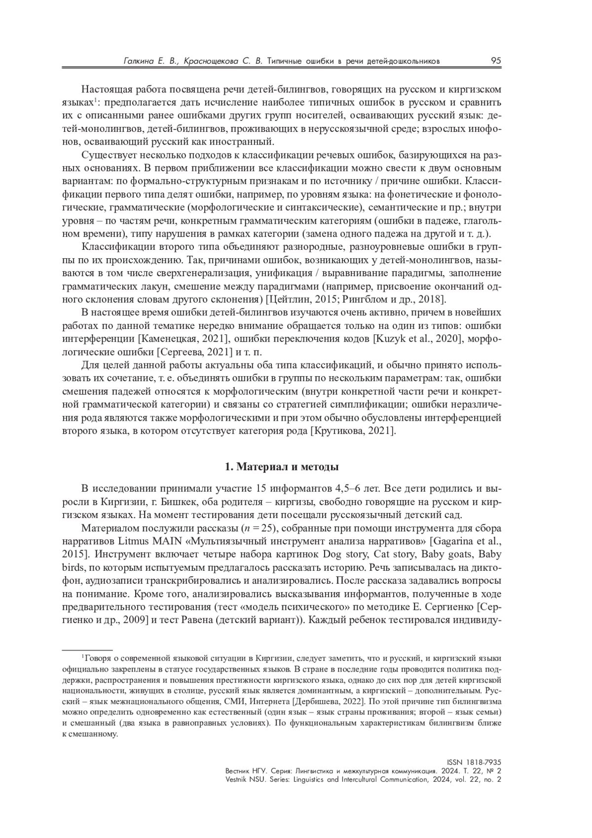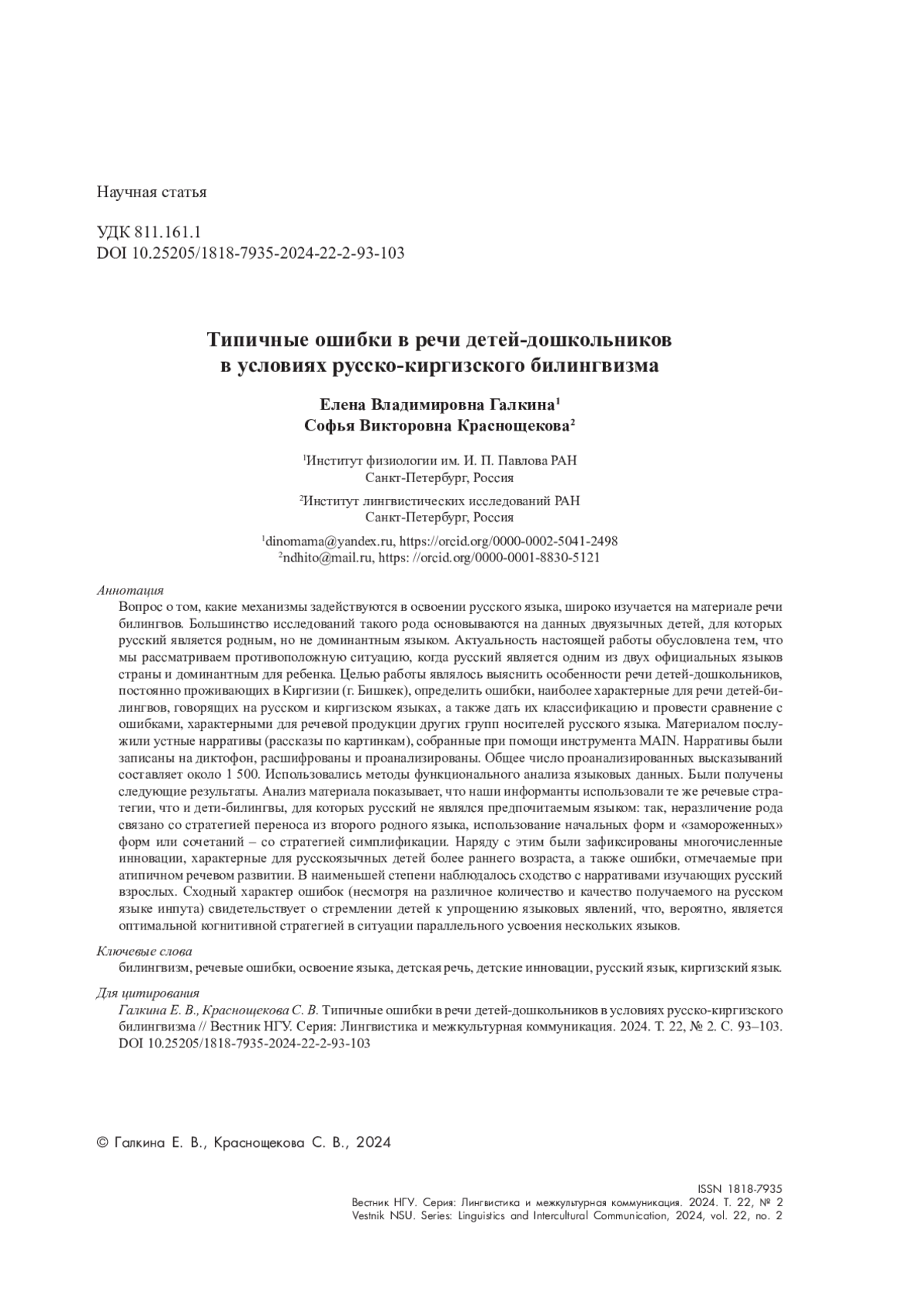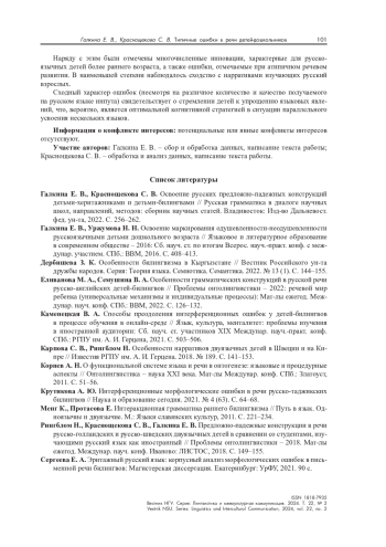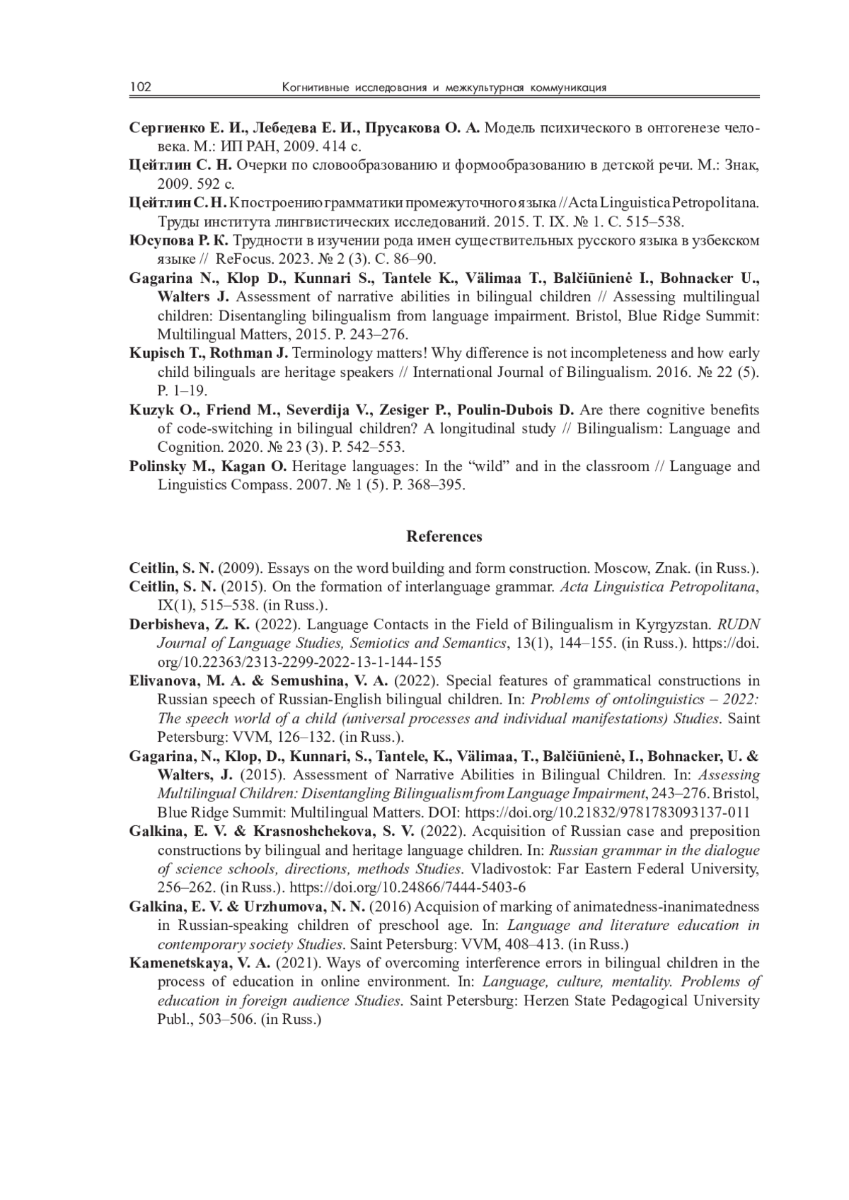 1. Галкина Е. В., Краснощекова С. В. Освоение русских предложно-падежных конструкций детьми-херитажниками и детьми-билингвами // Русская грамматика в диалоге научных школ, направлений, методов : сборник научных статей. Владивосток: Изд-во Дальневост. фед. ун-та, 2022. С. 256-262.