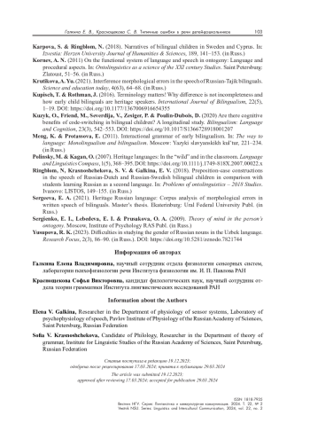8. Крутикова А. Ю. Интерференционные морфологические ошибки в речи русско-таджикских билингвов // Наука и образование сегодня. 2021. № 4 (63). С. 64-68.
