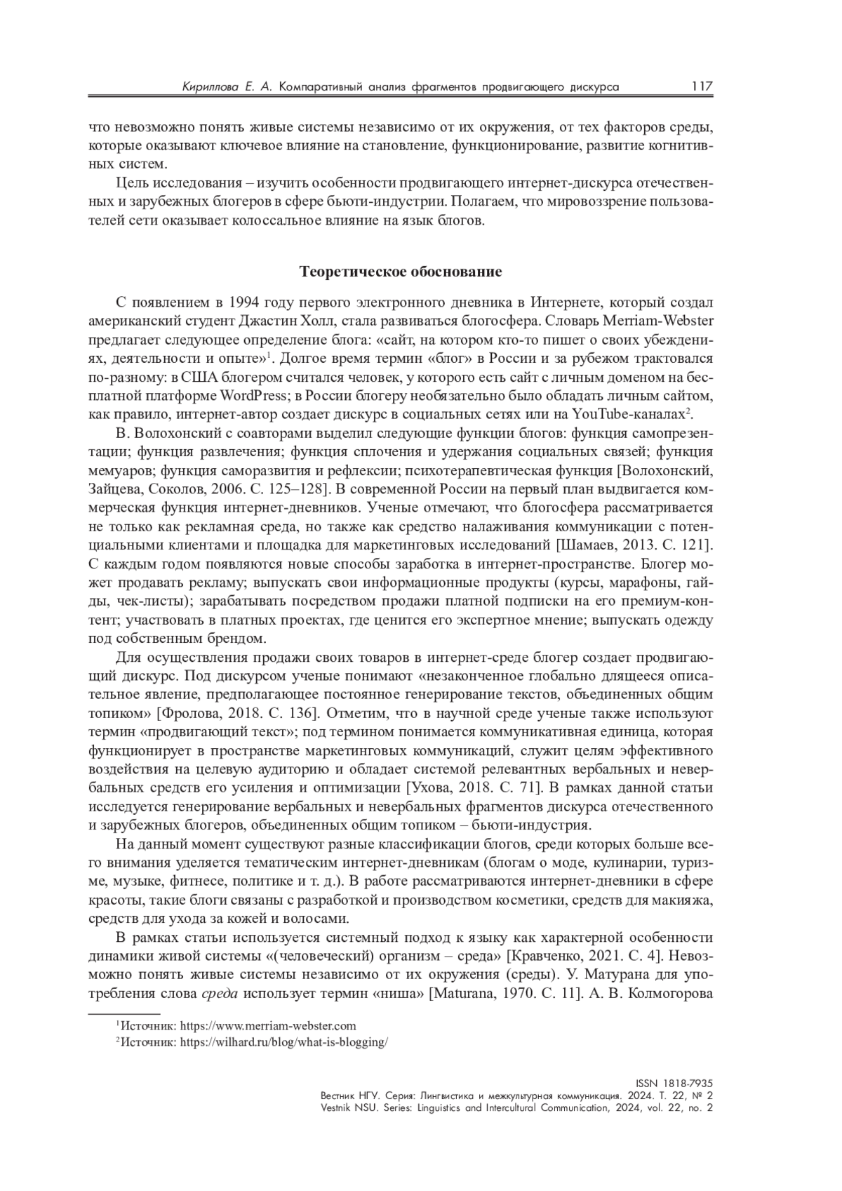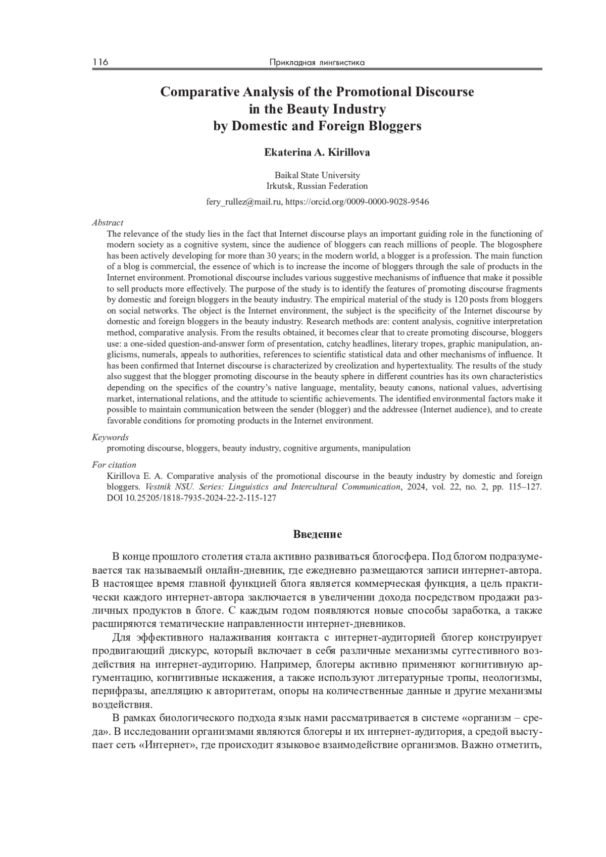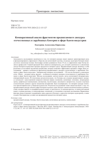 Цель исследования – выявить особенности фрагментов продвигающего дискурса отечественных и зарубежных блогеров в сфере бьюти-индустрии. Эмпирический материал исследования – 120 постов блогеров в социальных сетях.