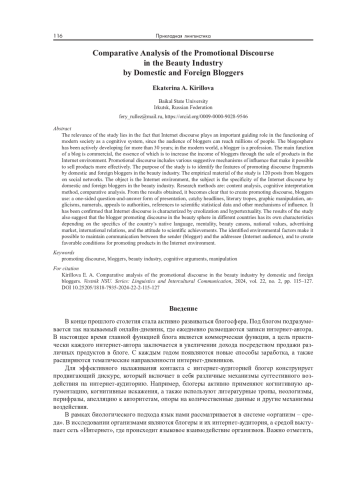 Методы исследования: контент-анализ, метод когнитивной интерпретации, компаративный анализ. Из полученных результатов видно, что блогеры для создания продвигающего дискурса используют: одностороннюю вопросно-ответную форму изложения, цепляющие заголовки, литературные тропы, графическую манипуляцию, англицизмы, числительные, апелляцию к авторитетам, отсылки к научным статистическим данным и другие механизмы воздействия. Было подтверждено, что интернет-дискурс отличается креолизованностью и гипертекстуальностью. Результаты исследования также свидетельствуют о том, что продвигающий дискурс в бьюти-сфере блогеров из разных стран обладает своими исключительными особенностями, которые зависят от специфики родного языка, от менталитета, от канонов красоты, от ценностей каждой нации, от рынка рекламы, от международных отношений, от отношения к научным достижениям. Выявленные факторы среды позволяют поддерживать связь адресанта (блогера) с адресатом (интернет-аудиторией), а также создают благоприятные условия для продвижения продуктов в интернет-среде.