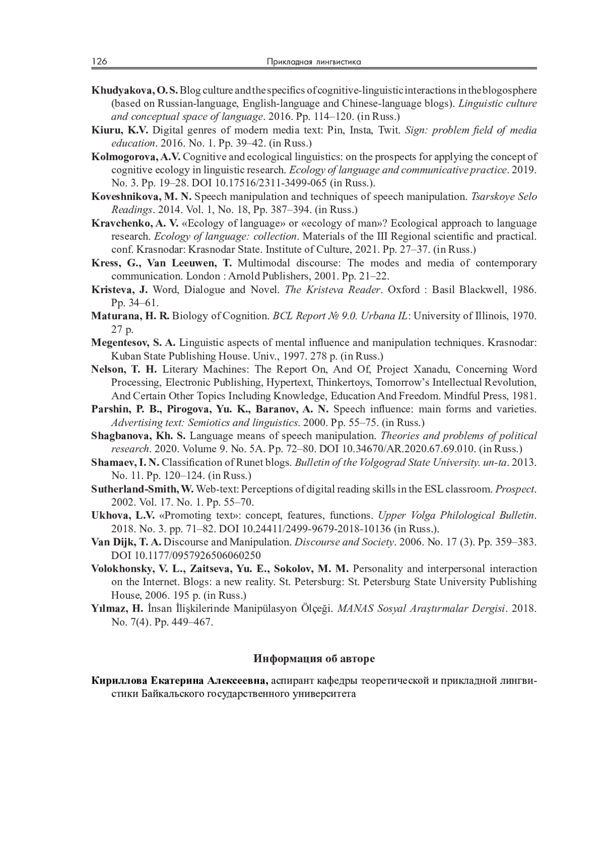 7. Ковешникова М. Н. Речевая манипуляция и приемы речевого манипулирования // Царско-сельские чтения. 2014. Вып. 1, № 18. С. 387-394.