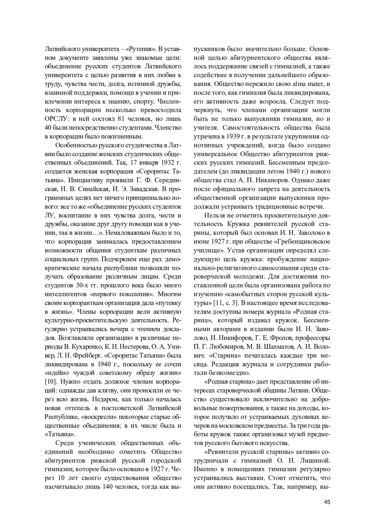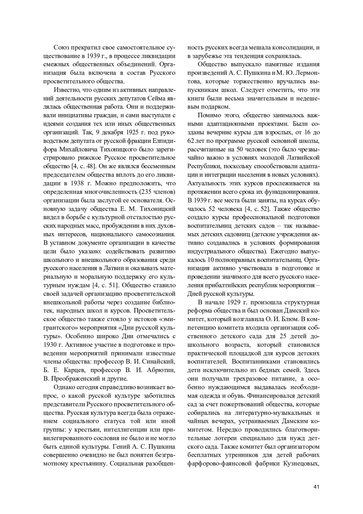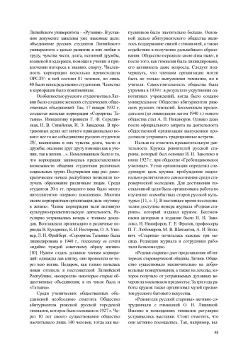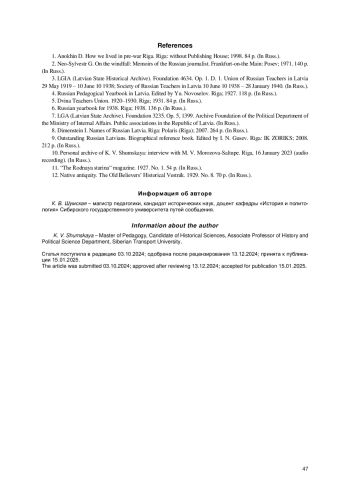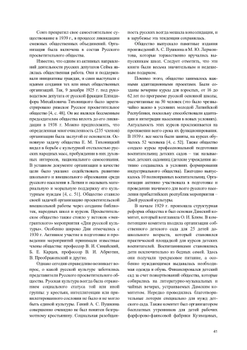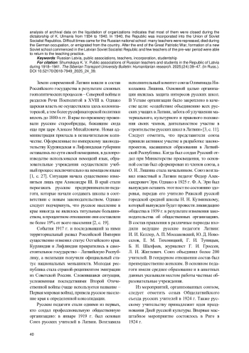 В работе анализируется процесс создания общественных объединений русскими педагогами в Латвийской Республике от момента юридического оформления суверенного государства до инкорпорации в состав СССР. Актуальность исследования определяется современной политикой Латвии в отношении национальных меньшинств, проживающих на территории государства, прежде всего русского. Автор исследует особенности деятельности русских общественных объединений. Подчеркивается многообразие организаций и определенная разобщенность русского населения Латвийской Республики. Раскрывается специфика православных и старообрядческих религиозных объединений. В русской педагогической среде можно выделить особенно ярких педагогов Ф. А. Эрна, Е. М. Тихоницкого, О. Н. Лишину, М. А. Каллистратова, которые создавали в Латвии русскую меньшинственную школу, находились в постоянном взаимодействии с коллегами за рубежом. В межвоенный период русские общественные организации выполняли важную задачу - способствовать оказанию всесторонней помощи тем, кто в ней нуждался. Материальное положение как русского студенчества, так и самих педагогов было часто затруднительным. Благотворительная деятельность организаций оказывала поддержку особо нуждающимся. Анализ архивных данных о ликвидации организаций свидетельствует о том, что большинство было закрыто в период диктатуры К. Улманиса с 1934 по 1940 гг. В 1940 г. произошла инкорпорация республики в состав СССР. Для русской национальной школы наступили нелегкие времена: многие педагоги были репрессированы, погибли во время немецкой оккупации или эмигрировали из страны. После окончания Великой Отечественной войны в Латвийской ССР началось формирование новой советской школы, и немногие педагоги довоенной поры смогли вернуться к педагогической практике.