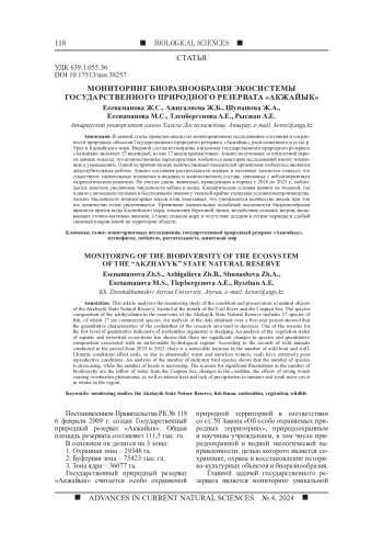 Статья: МОНИТОРИНГ БИОРАЗНООБРАЗИЯ ЭКОСИСТЕМЫ ГОСУДАРСТВЕННОГО ПРИРОДНОГО РЕЗЕРВАТА "АКЖАЙЫК" (2024)