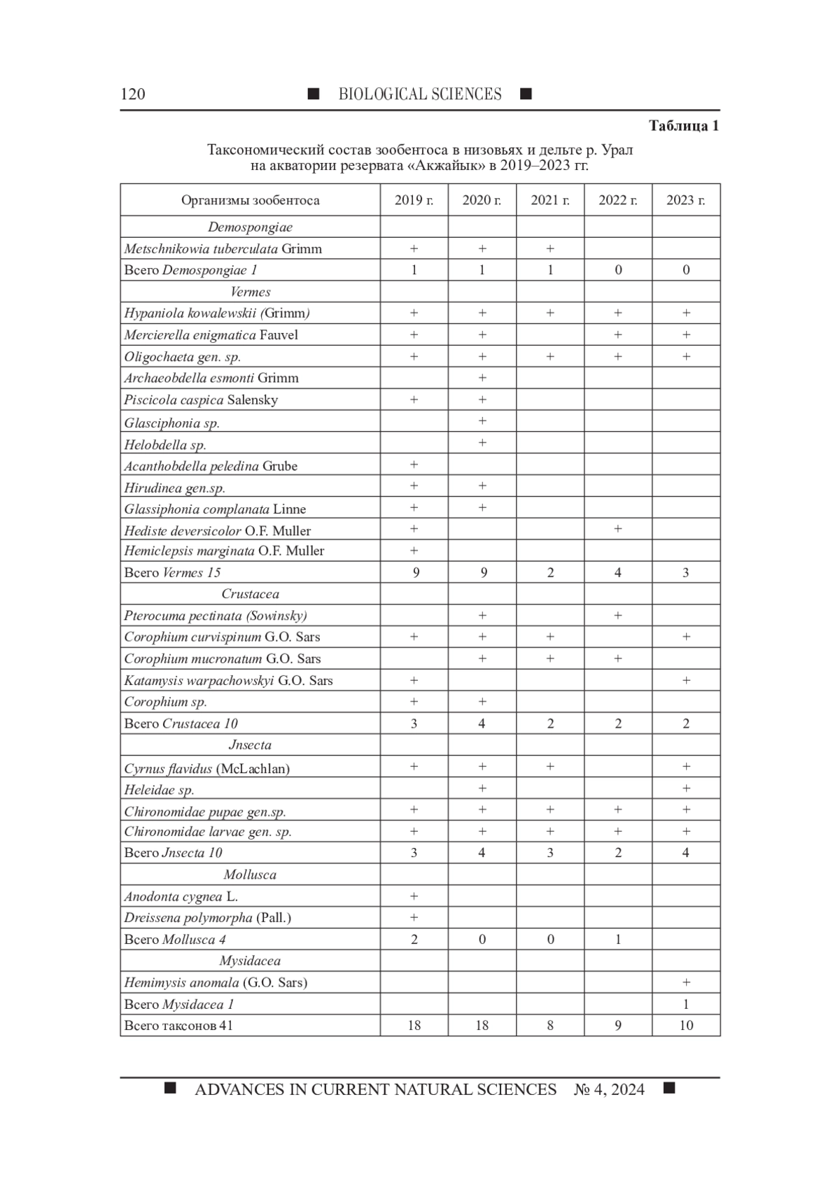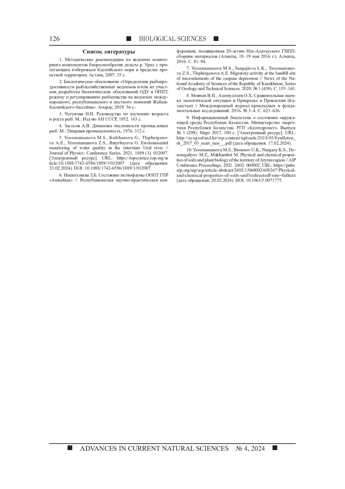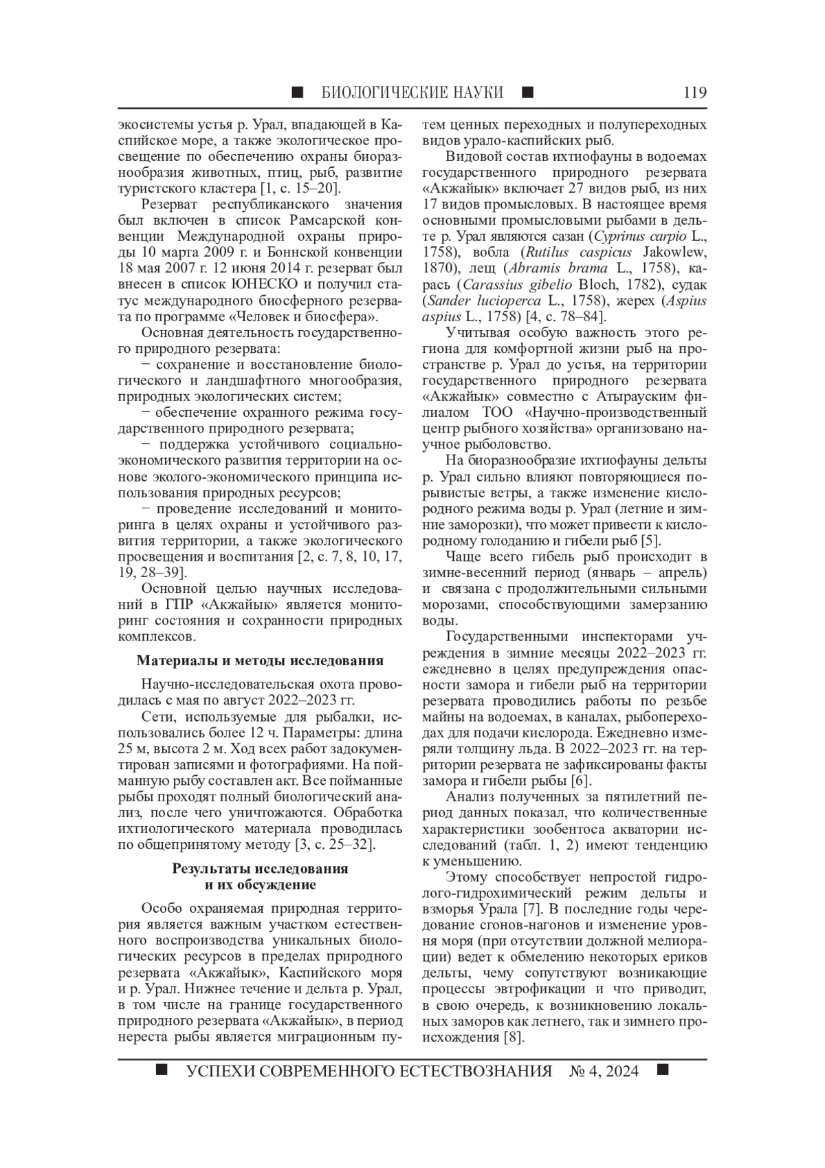 ЕСЕНАМАНОВА Ж. С., АЖИГАЛИЕВА Ж. Б., ШУНАШЕВА Ж. А., ЕСЕНАМАНОВА М. С., ТЛЕПБЕРГЕНОВА А. Е., РЫСЖАН А. Е. МОНИТОРИНГ БИОРАЗНООБРАЗИЯ ЭКОСИСТЕМЫ ГОСУДАРСТВЕННОГО ПРИРОДНОГО РЕЗЕРВАТА "АКЖАЙЫК" // УСПЕХИ СОВРЕМЕННОГО ЕСТЕСТВОЗНАНИЯ. 2024. № 4