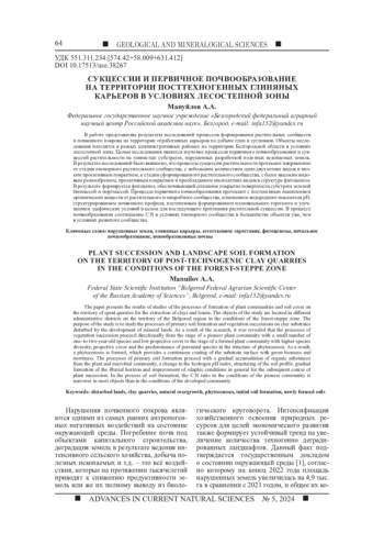 В работе представлены результаты исследований процессов формирования растительных сообществ и почвенного покрова на территории отработанных карьеров по добыче глин и суглинков. Объекты исследования находятся в разных административных районах на территории Белгородской области в условиях лесостепной зоны. Целью исследования является изучение процессов первичного почвообразования и сукцессий растительности на глинистых субстратах, нарушенных разработкой полезных ископаемых земель. В результате исследований было выявлено, что процессы сукцессии растительности протекают направленно от стадии пионерного растительного сообщества, с небольшим количеством одно-двухлетних видов и низким проективным покрытием, к стадии сформированного растительного сообщества, с более высоким видовым разнообразием, проективным покрытием и преобладанием многолетних видов в структуре фитоценоза. В результате формируется фитоценоз, обеспечивающий сплошное покрытие поверхности субстрата зеленой биомассой и мортмассой. Процессы первичного почвообразования протекают с постепенным накоплением органических веществ от растительного и микробного сообщества, изменением водородного показателя рН, структурированием почвенного профиля, постепенным формированием иллювиального горизонта и улучшением эдафических условий в целом для последующего протекания растительной сукцессии. В процессе почвообразования соотношение C: N в условиях пионерного сообщества в большинстве объектов уже, чем в условиях развитого сообщества.