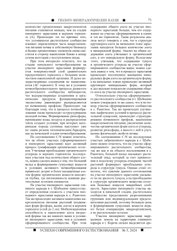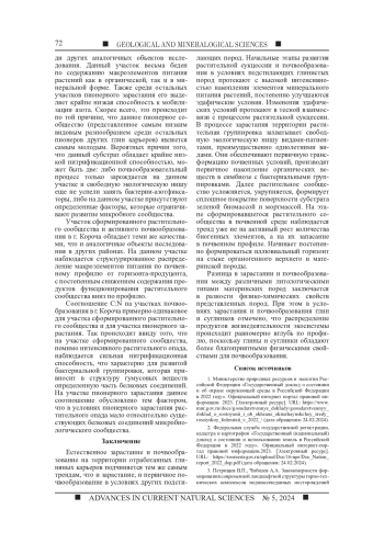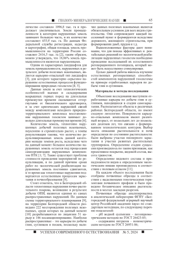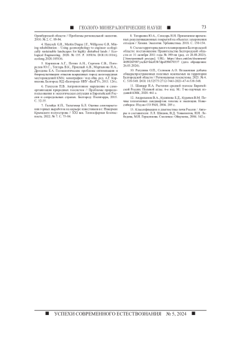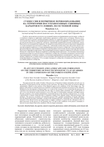 МАНУЙЛОВ А. А. СУКЦЕССИИ И ПЕРВИЧНОЕ ПОЧВООБРАЗОВАНИЕ НА ТЕРРИТОРИИ ПОСТТЕХНОГЕННЫХ ГЛИНЯНЫХ КАРЬЕРОВ В УСЛОВИЯХ ЛЕСОСТЕПНОЙ ЗОНЫ // УСПЕХИ СОВРЕМЕННОГО ЕСТЕСТВОЗНАНИЯ. 2024. № 5