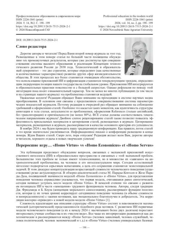 Вступительное слово главного редактора журнала “Профессиональное образование в современном мире” к выпуску Т. 14, № 2 (2024)