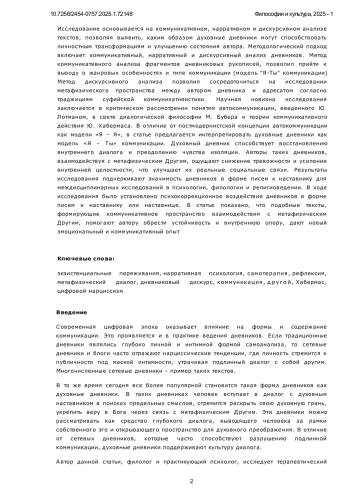 Ключевые фразы: экзистенциальные переживания, нарративная психология, самотерапия, РЕФЛЕКСИЯ, метафизический диалог, дневниковый дискурс, КОММУНИКАЦИЯ, Другой, хабермас, цифровой нарциссизм