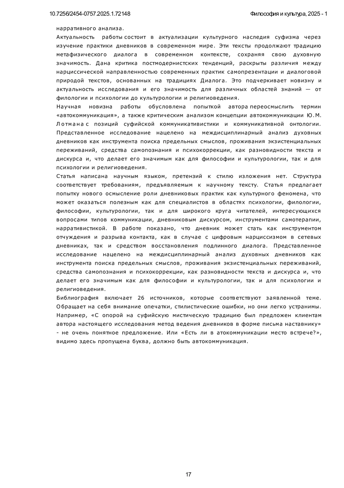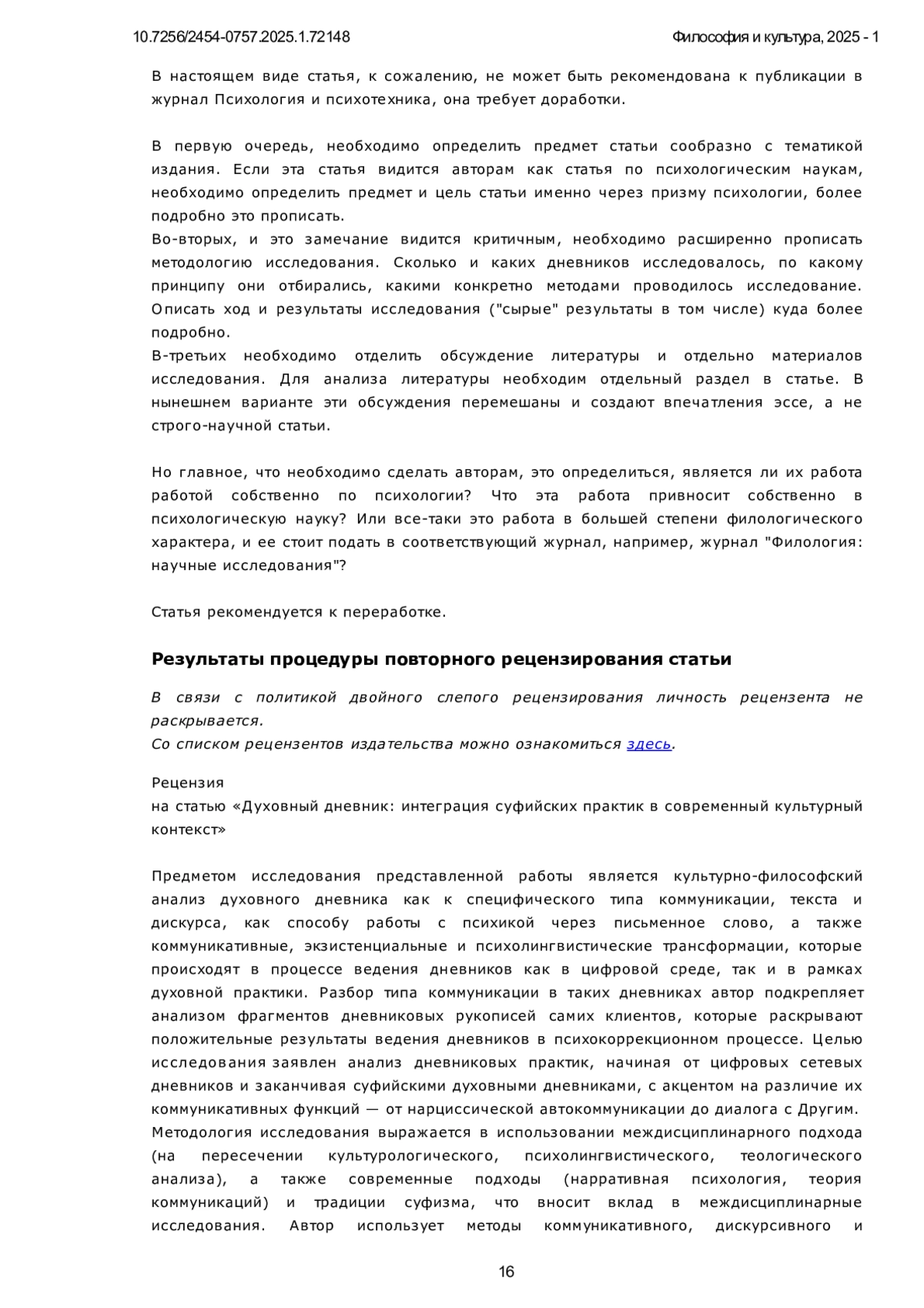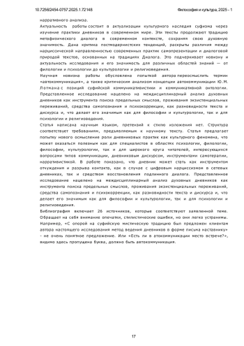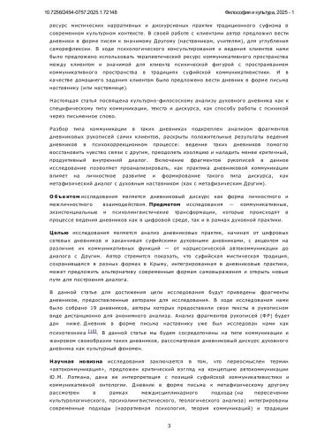 КАНГИЕВА А. М. ДУХОВНЫЙ ДНЕВНИК: ИНТЕГРАЦИЯ СУФИЙСКИХ ПРАКТИК В СОВРЕМЕННЫЙ КУЛЬТУРНЫЙ КОНТЕКСТ // ФИЛОСОФИЯ И КУЛЬТУРА. 2025. № 1