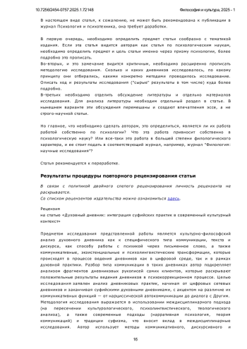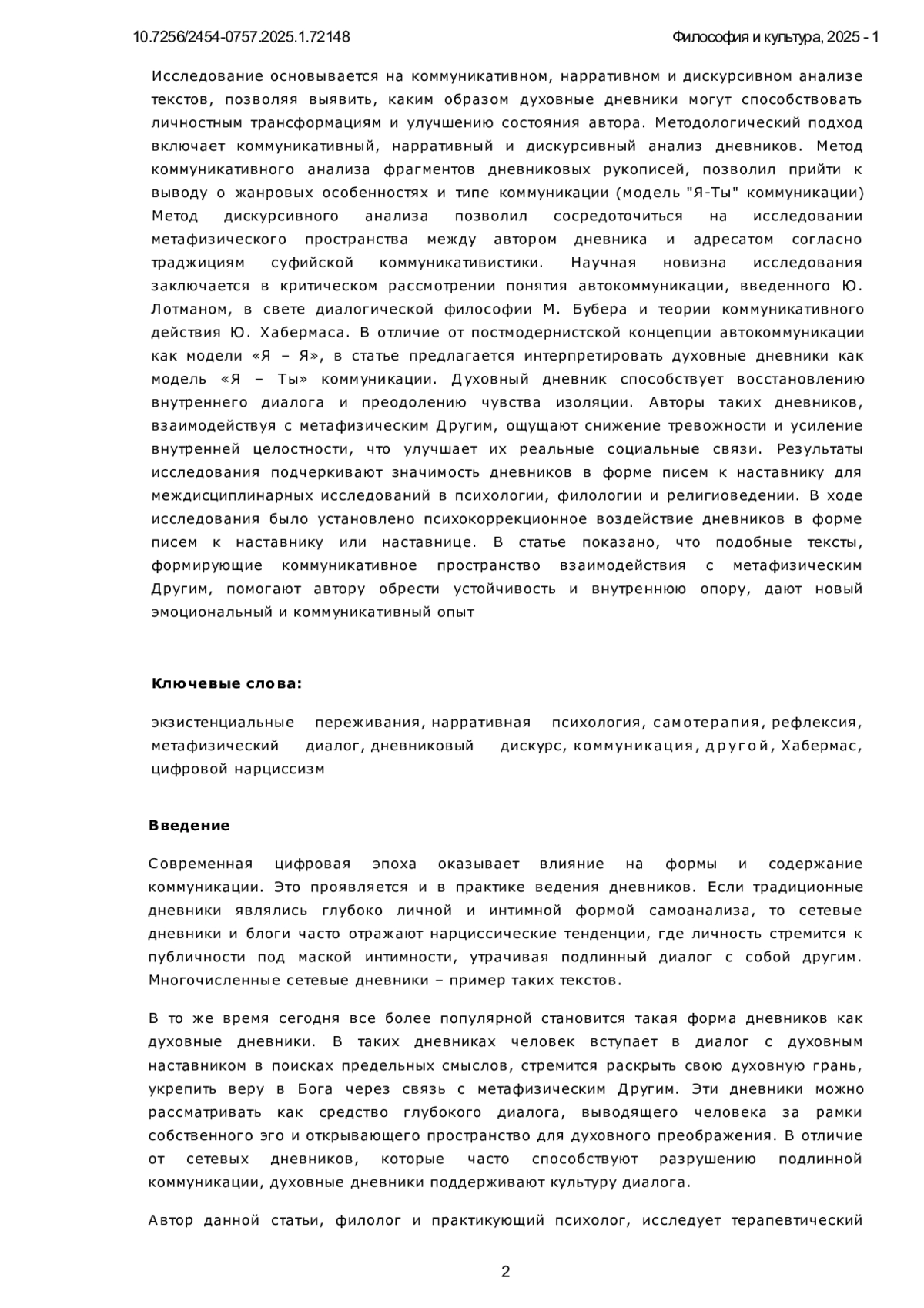 Исследование посвящено культурно-философскому анализу духовных дневников, оформленных в форме писем к наставнику, и их роли в личностных экзистенциальных переживаниях автора. В условиях современной цифровой культуры, где личная коммуникация нередко превращается в публичное самовыражение, духовные дневники, основанные на диалоге с Другим, предлагают альтернативный подход к саморефлексии. Такой дневник направлен на углубление внутреннего диалога, помощь в обретении целостности и снижение тревожности через взаимодействие с метафизическим Другим. Объектом исследования является дневниковый дискурс как способ личностного взаимодействия, а предметом - коммуникативные и психолингвистические изменения, происходящие в процессе ведения таких записей. Исследование основывается на коммуникативном, нарративном и дискурсивном анализе текстов, позволяя выявить, каким образом духовные дневники могут способствовать личностным трансформациям и улучшению состояния автора. Методологический подход включает коммуникативный, нарративный и дискурсивный анализ дневников. Метод коммуникативного анализа фрагментов дневниковых рукописей, позволил прийти к выводу о жанровых особенностях и типе коммуникации (модель “Я-Ты” коммуникации)Метод дискурсивного анализа позволил сосредоточиться на исследовании метафизического пространства между автором дневника и адресатом согласно траджициям суфийской коммуникативистики. Научная новизна исследования заключается в критическом рассмотрении понятия автокоммуникации, введенного Ю. Лотманом, в свете диалогической философии М. Бубера и теории коммуникативного действия Ю. Хабермаса. В отличие от постмодернистской концепции автокоммуникации как модели «Я - Я», в статье предлагается интерпретировать духовные дневники как модель «Я - Ты» коммуникации. Духовный дневник способствует восстановлению внутреннего диалога и преодолению чувства изоляции. Авторы таких дневников, взаимодействуя с метафизическим Другим, ощущают снижение тревожности и усиление внутренней целостности, что улучшает их реальные социальные связи. Результаты исследования подчеркивают значимость дневников в форме писем к наставнику для междисциплинарных исследований в психологии, филологии и религиоведении. В ходе исследования было установлено психокоррекционное воздействие дневников в форме писем к наставнику или наставнице. В статье показано, что подобные тексты, формирующие коммуникативное пространство взаимодействия с метафизическим Другим, помогают автору обрести устойчивость и внутреннюю опору, дают новый эмоциональный и коммуникативный опыт