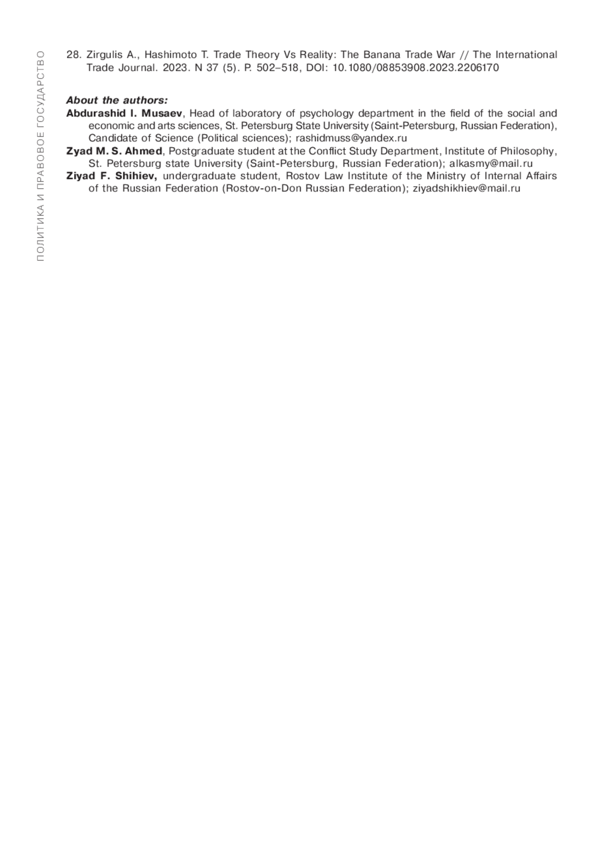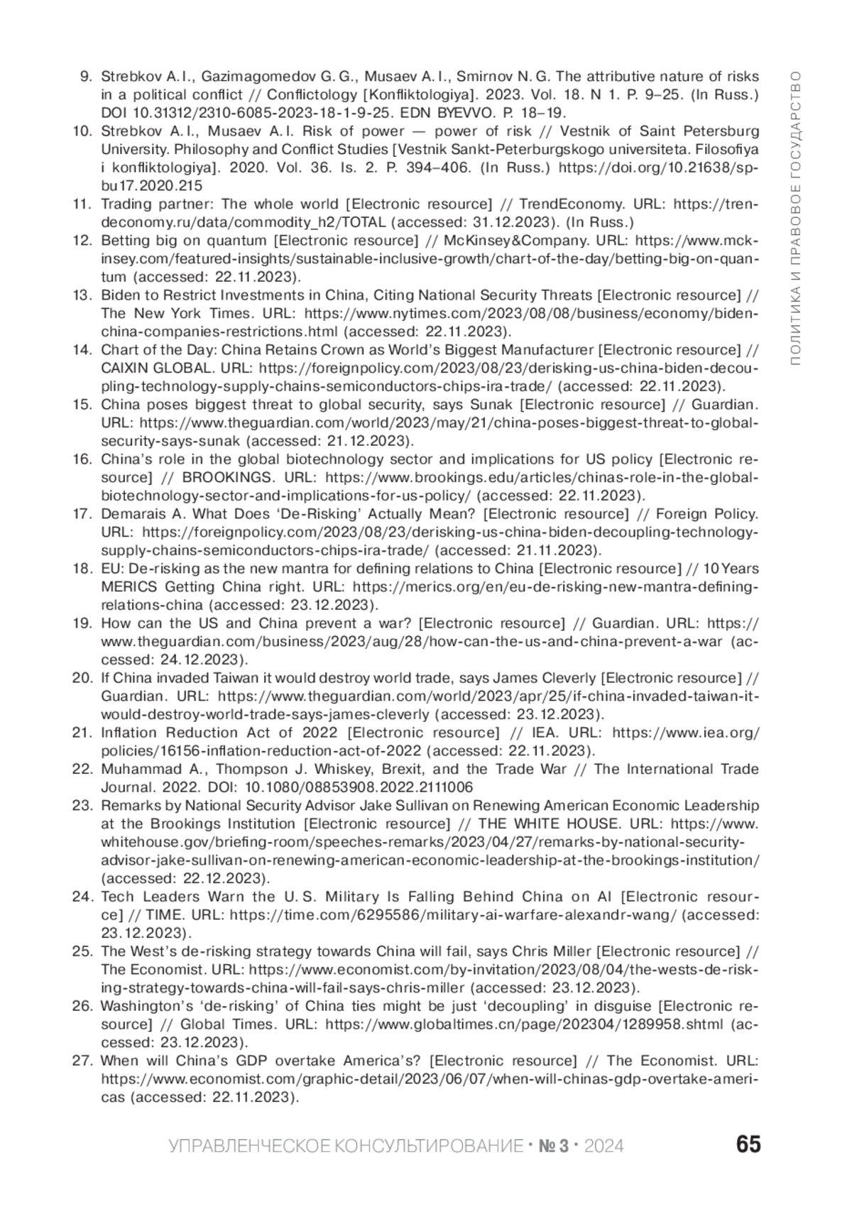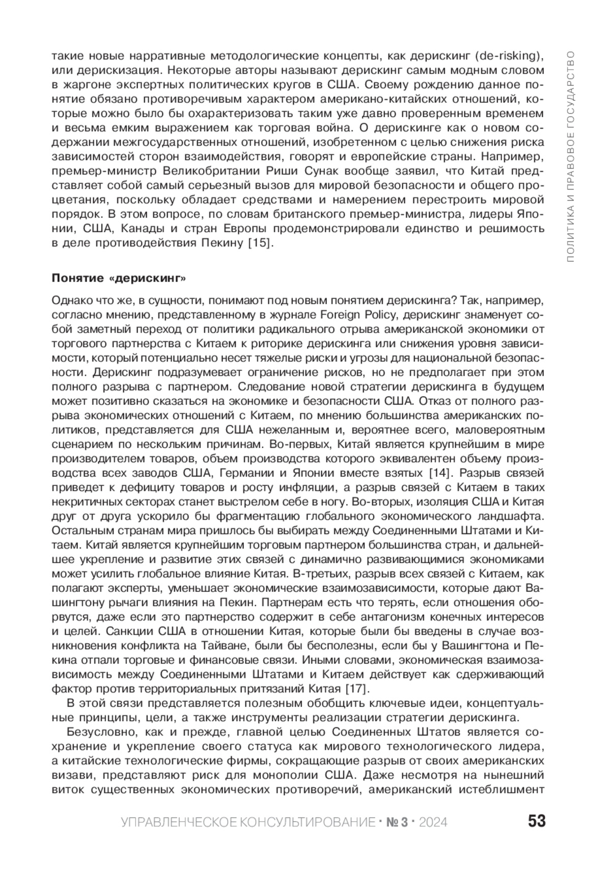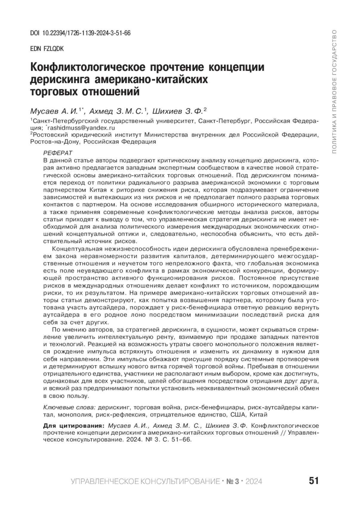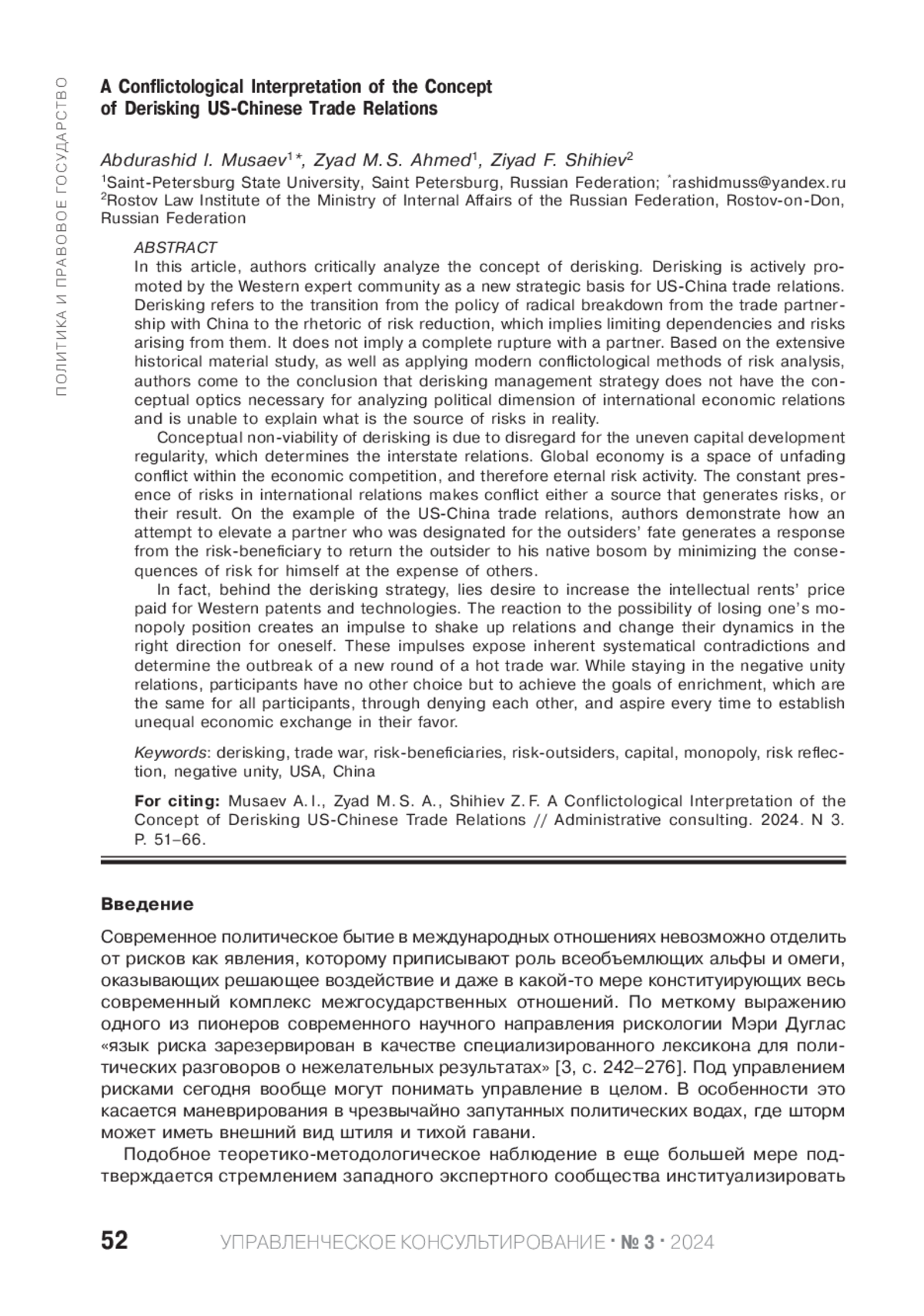 Статья: КОНФЛИКТОЛОГИЧЕСКОЕ ПРОЧТЕНИЕ КОНЦЕПЦИИ ДЕРИСКИНГА АМЕРИКАНО-КИТАЙСКИХ ТОРГОВЫХ ОТНОШЕНИЙ (2024)