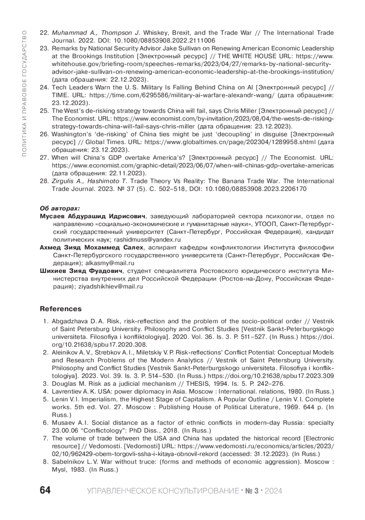 МУСАЕВ А. И., АХМЕД З. М., ШИХИЕВ З. Ф. КОНФЛИКТОЛОГИЧЕСКОЕ ПРОЧТЕНИЕ КОНЦЕПЦИИ ДЕРИСКИНГА АМЕРИКАНО-КИТАЙСКИХ ТОРГОВЫХ ОТНОШЕНИЙ // УПРАВЛЕНЧЕСКОЕ КОНСУЛЬТИРОВАНИЕ. 2024. № 3 (183)