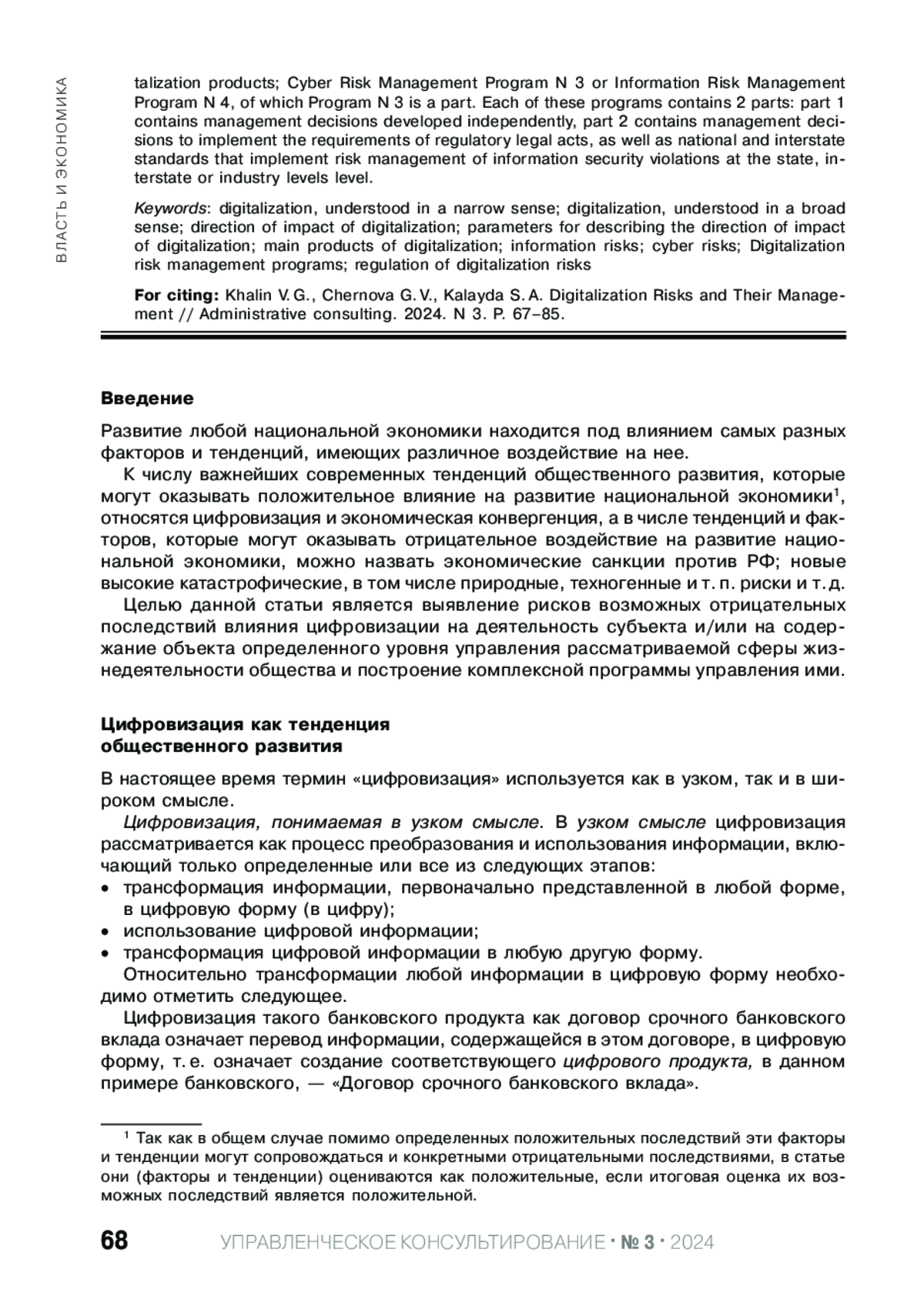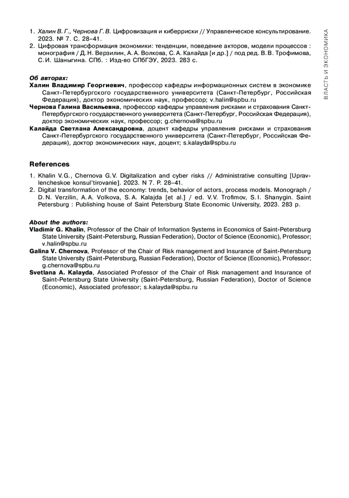 1. Халин В. Г., Чернова Г. В. Цифровизация и киберриски // Управленческое консультирование. 2023. № 7. С. 28-41. EDN: DENMOZ