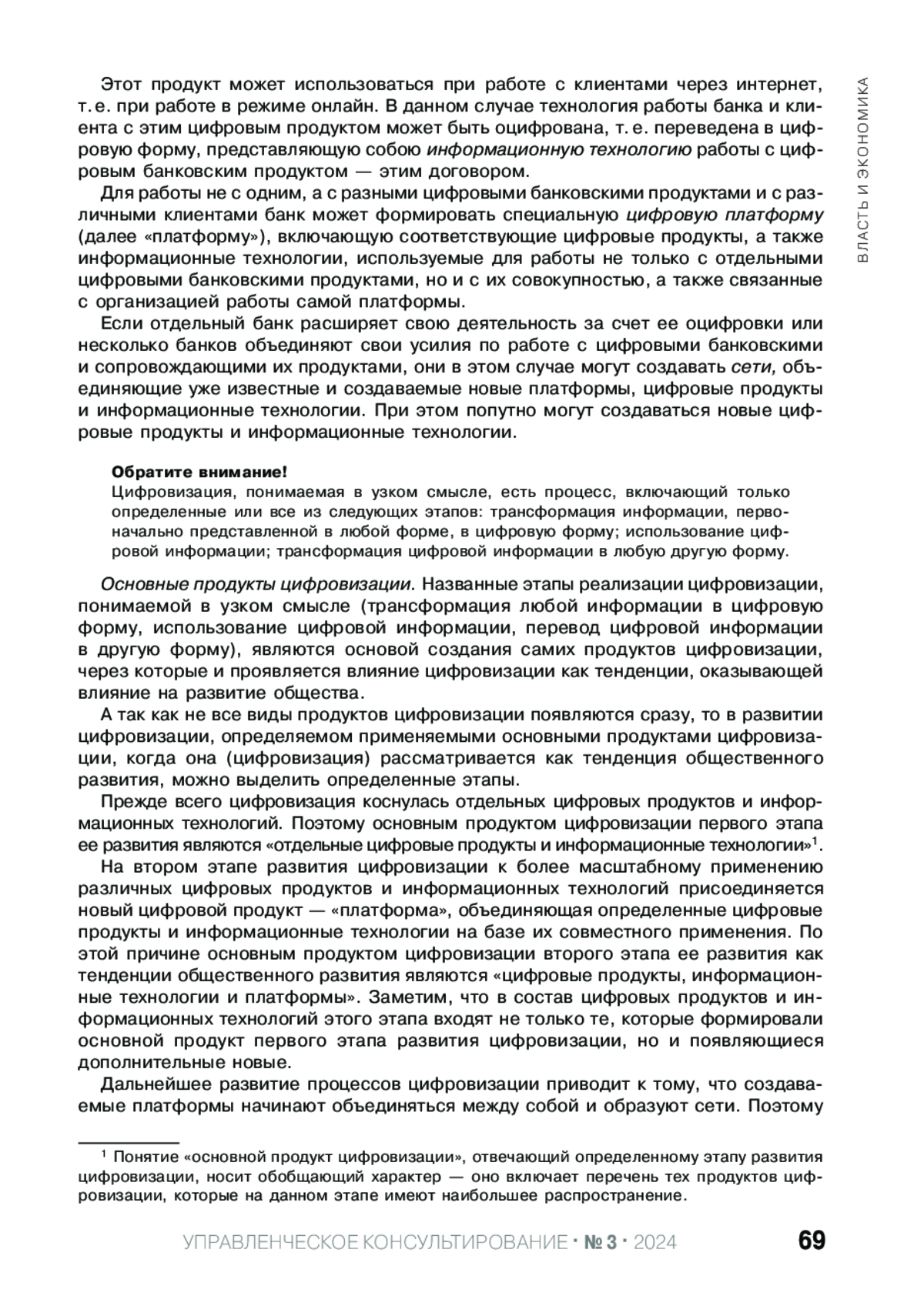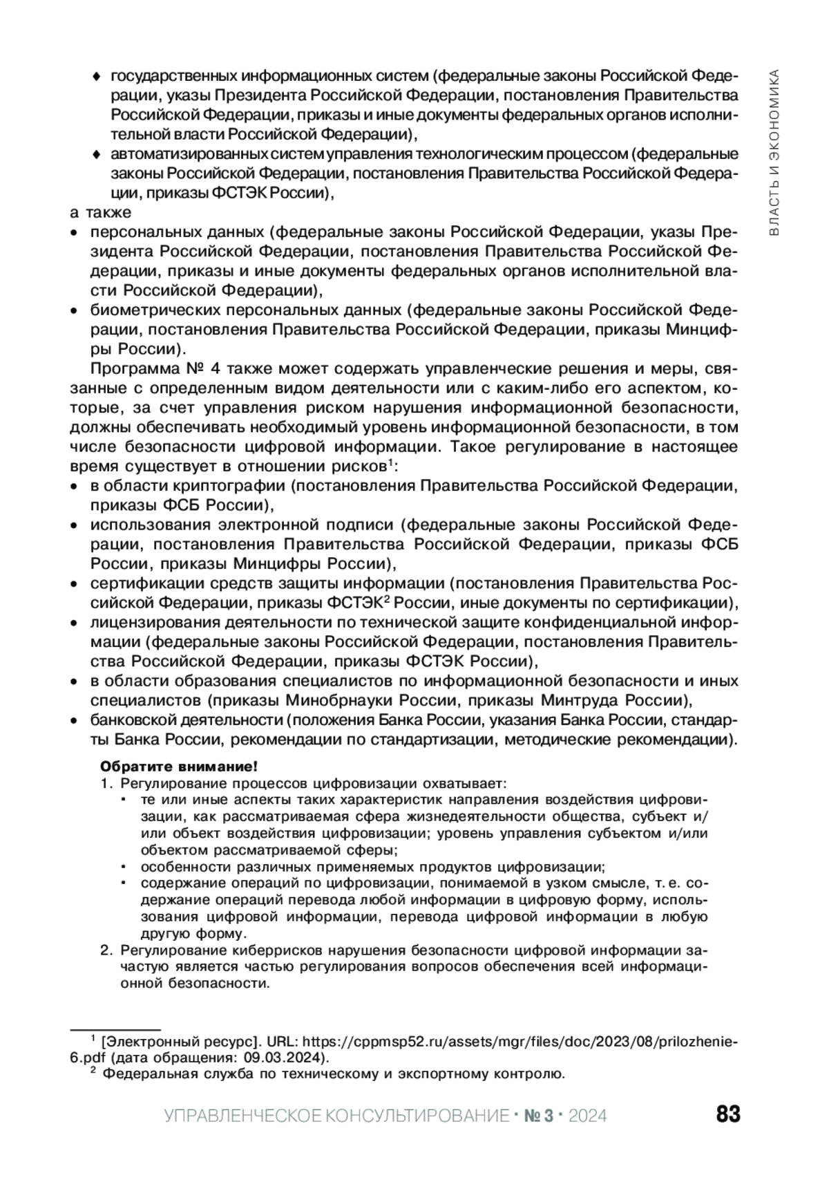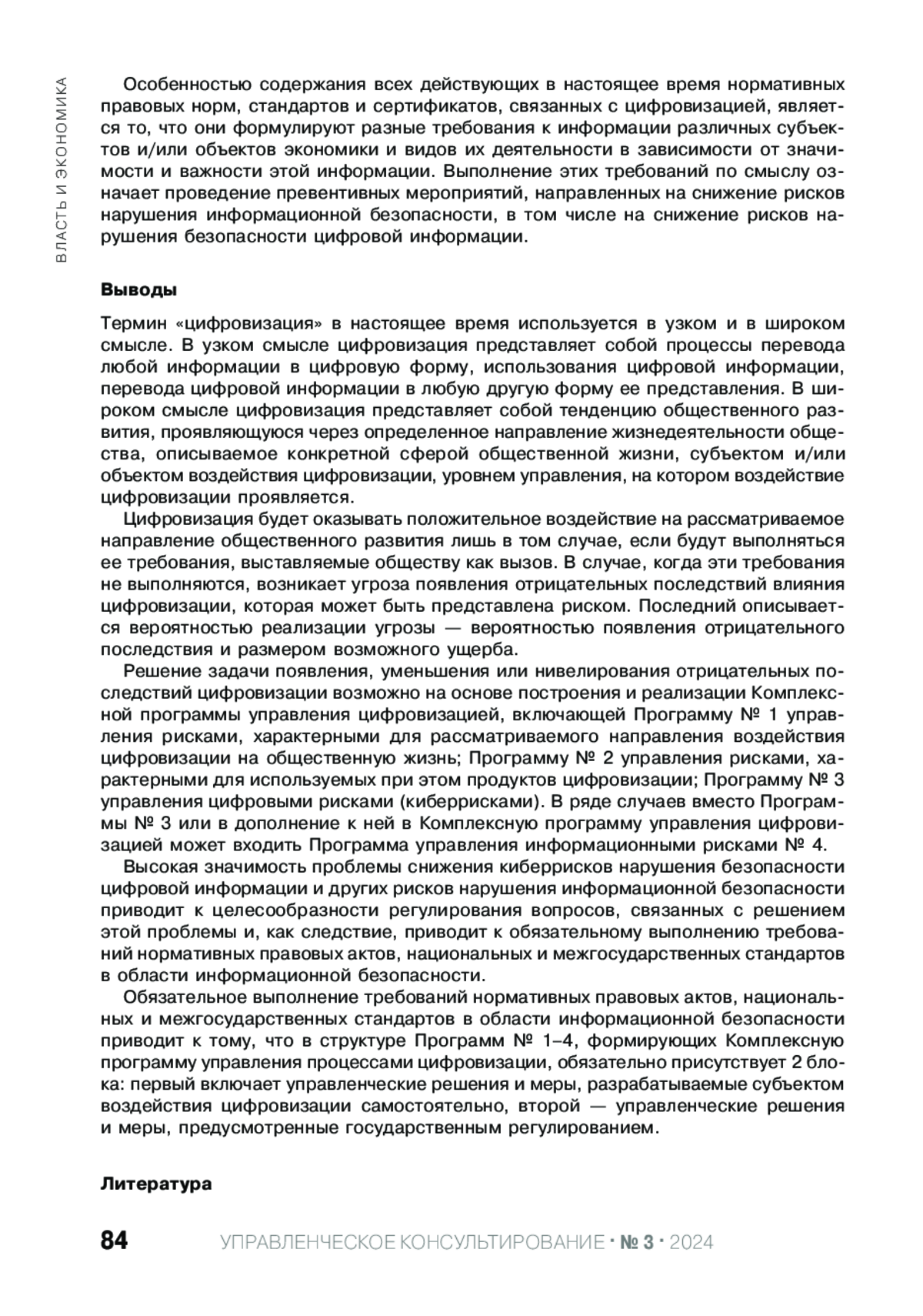 Цифровизация как важнейшая тенденция современного развития экономики и общества может сопровождаться не только положительными, но и отрицательными последствиями. Для того чтобы она оказывала только положительное воздействие, необходимо выполнить те требования, которые она выставляет обществу в виде содержания вызовов. В том случае, когда эти требования не выполняются, возникает угроза появления отрицательных последствий воздействия цифровизации, которые предлагается описывать через риск. Проблему усиления положительного и уменьшения отрицательного влияния цифровизации на деятельность определенного субъекта и/или на содержание какого-либо объекта воздействия цифровизации в статье предлагается решать на основе создания и внедрения Комплексной программы управления рисками цифровизации. Она включает Программу № 1 управления рисками, обусловленными влиянием цифровизации на определенное направление жизнедеятельности общества; Программу № 2 управления рисками, обусловленными применением основных продуктов цифровизации; Программу № 3 управления киберрисками или Программу № 4 управления информационными рисками, частью которой является Программа № 3. Каждая из этих программ содержит 2 части: ч. 1 содержит управленческие решения, разрабатываемые самостоятельно, ч. 2 - содержит управленческие решения по реализации требований нормативных правовых актов, а также национальных и межгосударственных стандартов, реализующих управление рисками нарушения информационной безопасности на государственном, межгосударственном или на отраслевом уровне.