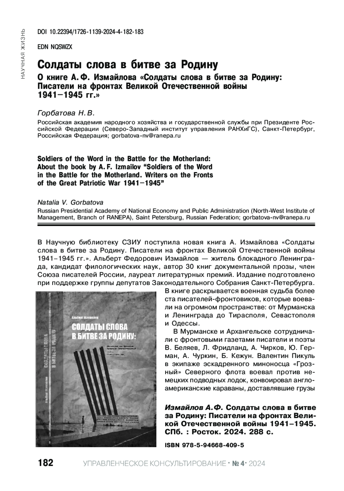 В Научную библиотеку СЗИУ поступила новая книга А. Измайлова «Солдаты слова в битве за Родину. Писатели на фронтах Великой Отечественной войны 1941–1945 гг.». Альберт Федорович Измайлов — житель блокадного Ленинграда, кандидат филологических наук, автор 30 книг документальной прозы, член Союза писателей России, лауреат литературных премий.