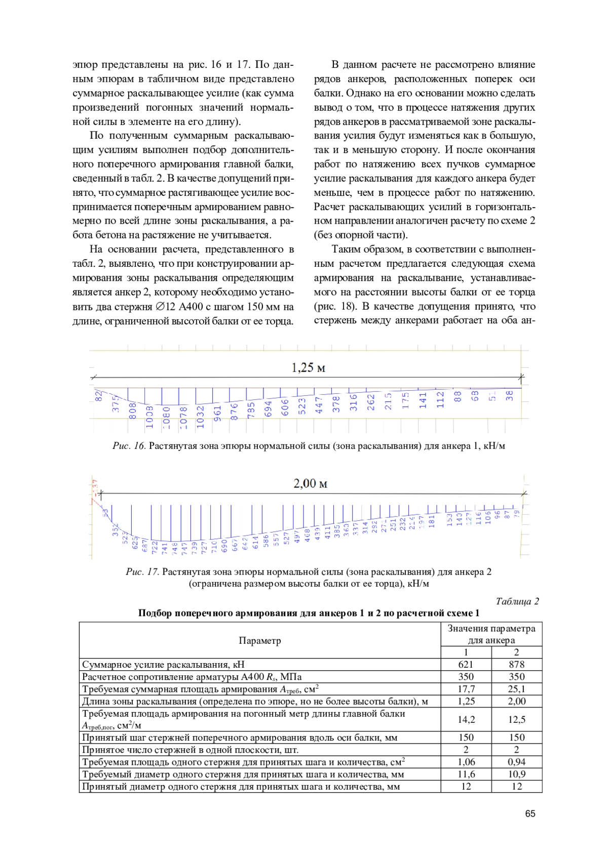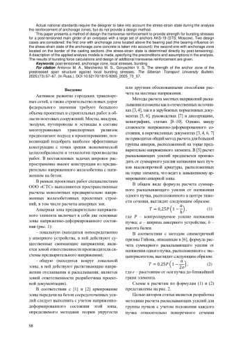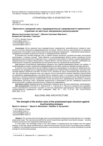 Бетон анкерной зоны предварительно напряженного железобетонного элемента находится в сложном напряженно-деформированном состоянии. Область бетона, расположенная за анкерным устройством, испытывает значительные местные растягивающие напряжения - напряжения раскалывания, направленные поперек продольного усилия от предварительного обжатия. В большинстве случаев анкерные зоны в главных балках пролетных строений мостовых конструкций расположены у опорных сечений. Таким образом, в рассматриваемой области может находиться густое армирование для восприятия поперечной силы, а также крутящего момента. Однако, помимо армирования, предусмотренного в рамках общей работы главной балки в составе пролетного строения, необходимо дополнительное поперечное армирование для восприятия местных напряжений раскалывания. Действующие отечественные нормативные документы при подборе армирования данных зон требуют от проектировщика учитывать напряженно-деформированное состояние, однако не приводят методику расчета. В данной статье представлен метод подбора поперечного армирования на восприятие напряжений раскалывания для предварительно напряженной железобетонной главной балки путепровода с большим количеством анкеров стаканного типа АКС-19 (ООО «СТС», Москва) на торце. Рассмотрено два расчетных случая: при расположении анкерной зоны над опорной частью (учитывается влияние опирания главной балки на напряженно-деформированное состояние бетона анкерной зоны) и на границе секций бетонирования пролетного строения (напряженно-деформированное состояние бетона анкерной зоны определяется непосредственно предварительным напряжением пучков высокопрочного армирования). Выполнено описание применяемых расчетных схем с указанием предпосылок и допущений в расчете. Приведены результаты расчетов усилий и подбора дополнительного поперечного армирования.