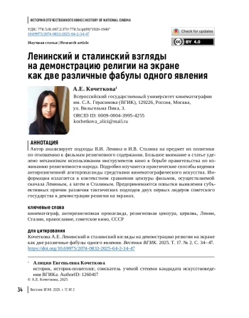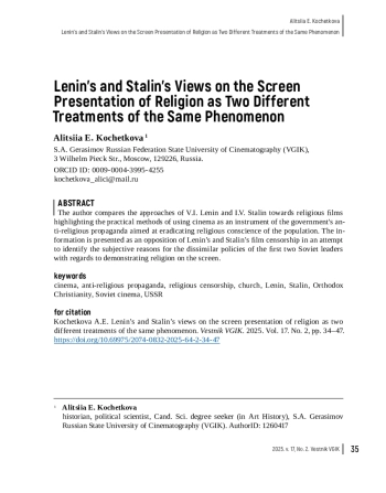 Автор анализирует подходы В. И. Ленина и И. В. Сталина на предмет их политики по отношению к фильмам религиозного содержания. Большое внимание в статье уделено механизмам использования инструментов кино в борьбе правительства по изживанию религиозности народа. Подробно изучаются практические способы ведения антирелигиозной агитпропаганды средствами кинематографического искусства. Информация излагается в контекстном сравнении цензуры фильмов, осуществляемой сначала Лениным, а затем и Сталиным. Предпринимаются попытки выявления субъективных причин различия тактических подходов двух первых лидеров советского государства к демонстрации религии на экранах.