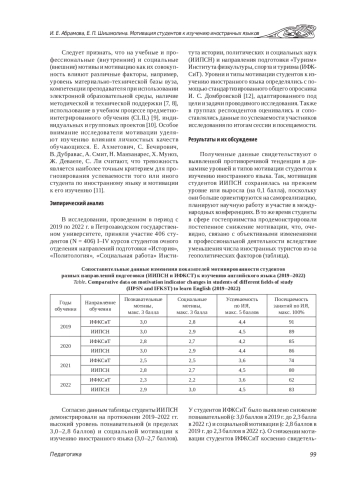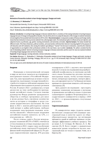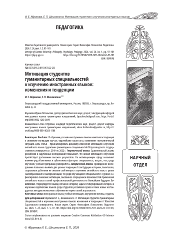 Введение. В обучении россиян иностранным языкам наметилась тенденция к снижению мотивации изучать европейские языки из-за изменения геополитической ситуации. Цель статьи – проанализировать динамику изменения мотивации к изучению английского языка студентами гуманитарных специальностей Петрозаводского государственного университета с 2019 по 2022 г.