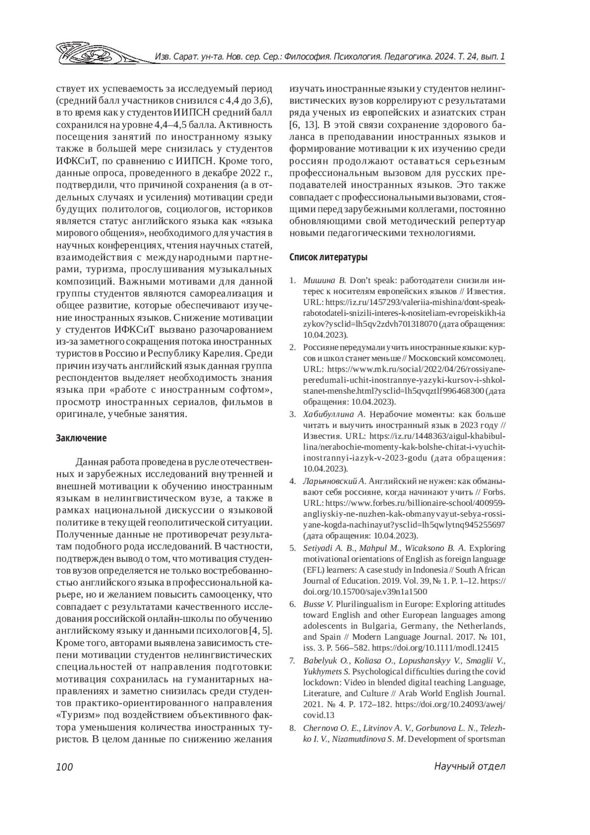 5. Setiyadi A. B., Mahpul M., Wicaksono B. A. Exploring motivational orientations of English as foreign language (EFL) learners: A case study in Indonesia // South African Journal of Education. 2019. Vol. 39, № 1. P. 1-12. DOI: 10.15700/saje.v39n1a1500