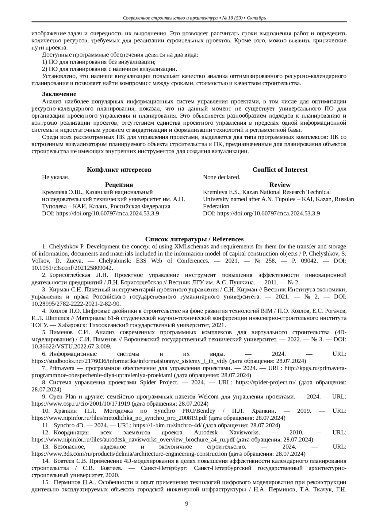 5. Pimenov S.I. Analiz sovremennyh programmnyh kompleksov dlja virtual’nogo stroitel’stva (4D-modelirovanija) [Analysis of modern software systems for virtual construction (4D modeling)] / S.I. Pimenov // Voronezhskij gosudarstvennyj tehnicheskij universitet [Voronezh State Technical University]. — 2022. — № 3. — DOI: 10.36622/VSTU.2022.67.3.009. [in Russian]