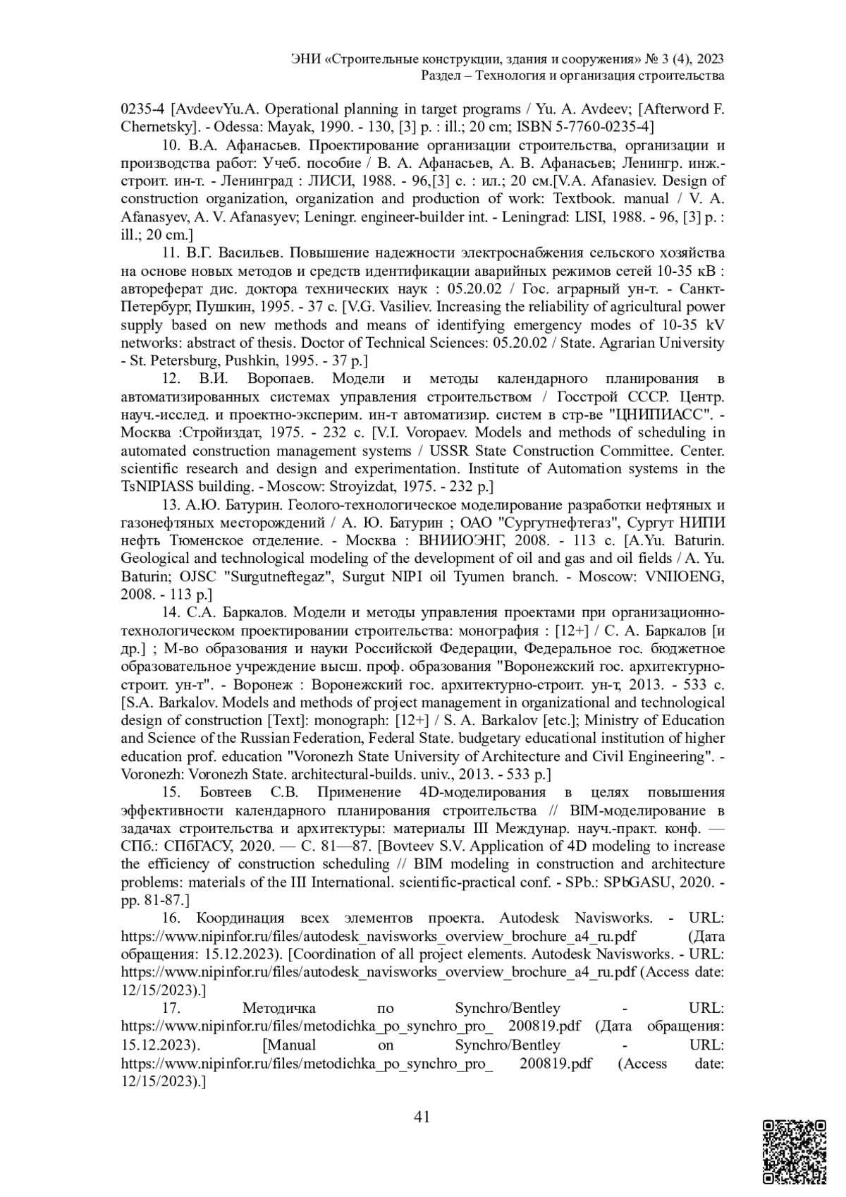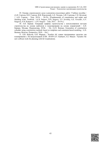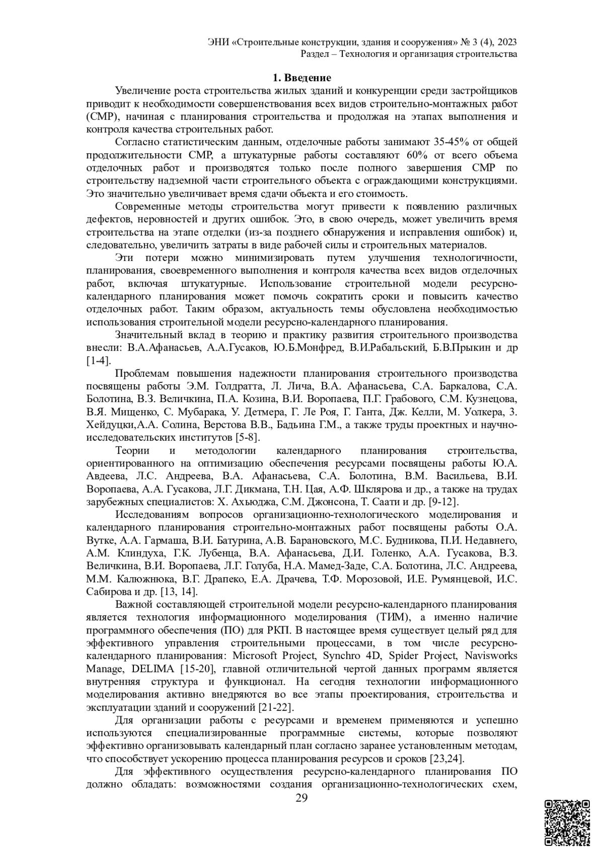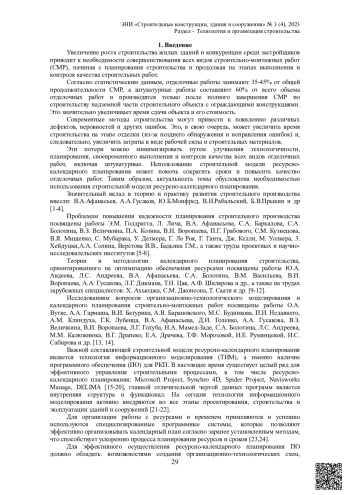 В данной работе автор рассматривает важность учета различных факторов при ресурсно-календарном планировании, особенно в контексте строительных проектов. Основное внимание уделяется применению технологий информационного моделирования и программного обеспечения Synchro 4D для эффективного планирования внутренних отделочных работ в жилых зданиях. В работе описывается, как использование специализированного программного обеспечения позволяет составлять календарные графики, контролировать выполнение работ и вносить корректировки при необходимости, что в свою очередь позволяет назначать периоды проверки и контроля качества выполненных работ, для адаптации календарных графиков к реальным условиям производства работ. Авторы предлагают строительную модель в виде трех составляющих: календарный график, модель здания и сметная документация. Произведен расчет сроков и используемых ресурсов строительной модели в сравнении с аналогами планируемого строительства здания.