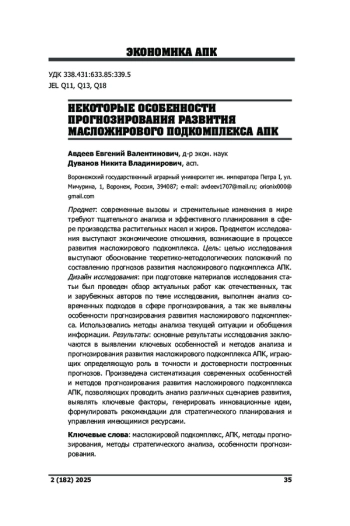 Предмет: современные вызовы и стремительные изменения в мире требуют тщательного анализа и эффективного планирования в сфере производства растительных масел и жиров. Предметом исследования выступают экономические отношения, возникающие в процессе развития масложирового подкомплекса. Цель: целью исследования выступают обоснование теоретико-методологических положений по составлению прогнозов развития масложирового подкомплекса АПК. Дизайн исследования: при подготовке материалов исследования статьи был проведен обзор актуальных работ как отечественных, так и зарубежных авторов по теме исследования, выполнен анализ современных подходов в сфере прогнозирования, а так же выявлены особенности прогнозирования развития масложирового подкомплекса. Использовались методы анализа текущей ситуации и обобщения информации. Результаты: основные результаты исследования заключаются в выявлении ключевых особенностей и методов анализа и прогнозирования развития масложирового подкомплекса АПК, играющих определяющую роль в точности и достоверности построенных прогнозов. Произведена систематизация современных особенностей и методов прогнозирования развития масложирового подкомплекса АПК, позволяющих проводить анализ различных сценариев развития, выявлять ключевые факторы, генерировать инновационные идеи, формулировать рекомендации для стратегического планирования и управления имеющимися ресурсами.